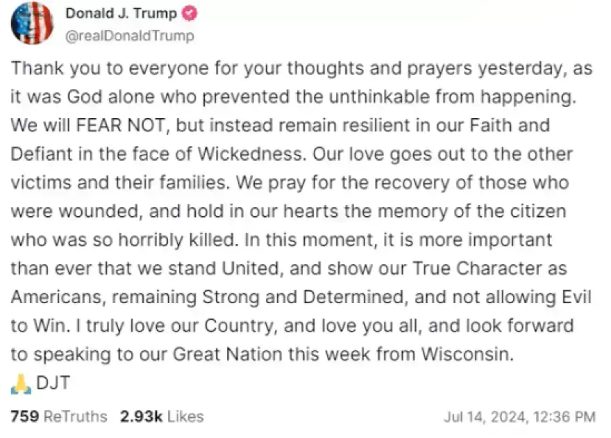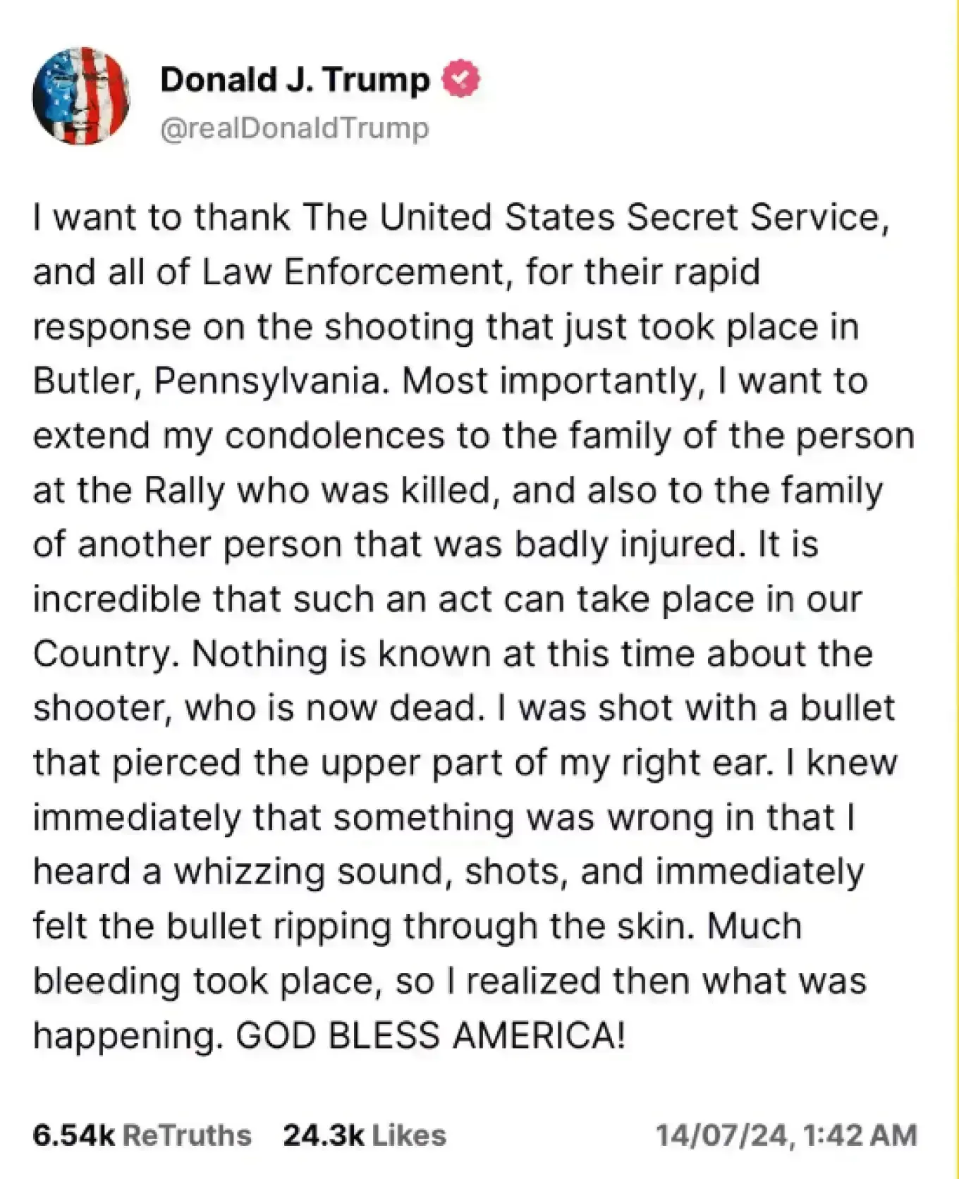 Αυτή ήταν η δεύτερη ανάρτησή του. Στην πρώτη είχε γράψει: «Το πιο σημαντικό, θέλω να εκφράσω τα συλλυπητήριά μου στην οικογένεια του ατόμου στη συγκέντρωση που σκοτώθηκε, καθώς και στην οικογένεια ενός άλλου ατόμου που τραυματίστηκε σοβαρά. Είναι απίστευτο ότι μια τέτοια πράξη μπορεί να γίνει στη χώρα μας. Τίποτα δεν είναι γνωστό αυτή τη στιγμή για τον δράστη, ο οποίος είναι πλέον νεκρός. Με πυροβόλησαν, μια σφαίρα μου τρύπησε το πάνω μέρος του δεξιού μου αυτιού. Ήξερα αμέσως ότι κάτι δεν πήγαινε καλά όταν άκουσα έναν ήχο, πυροβολισμούς και αμέσως ένιωσα τη σφαίρα να σκίζει το δέρμα. “Έτρεξε πολύ αίμα, οπότε κατάλαβα τι συνέβαινε. Ο ΘΕΟΣ ΝΑ ΕΥΛΟΓΕΙ ΤΗΝ ΑΜΕΡΙΚΗ!”.