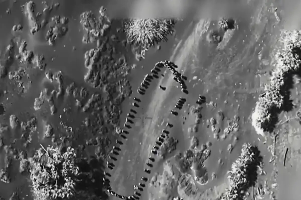 Οι εικόνες με τους Χούθι στην Υεμένη ασπρόμαυρες, τραβηγμένες από ψηλά —κατά πάσα πιθανότητα από στρατιωτικό drone— δείχνουν δεκάδες ανθρώπους που έχουν σχηματίσει κύκλο, προτού πέσει βόμβα.