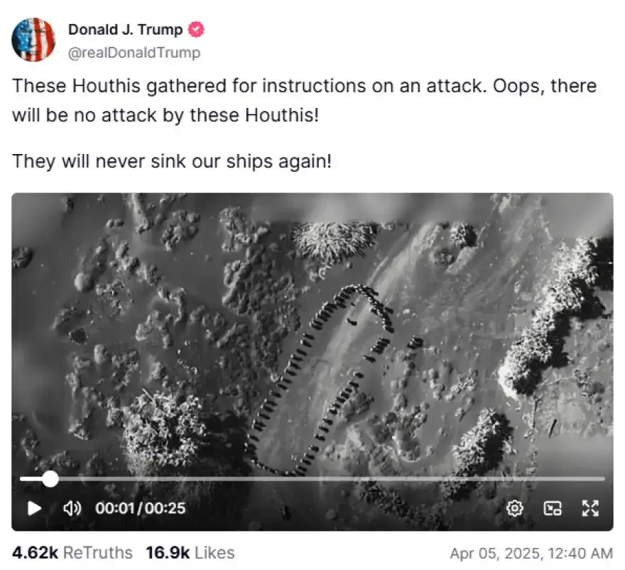 «Αυτοί οι Χούθι είχαν συγκεντρωθεί για να λάβουν διαταγές για μια επίθεση», έγραψε ο Ντόναλντ Τραμπ πάνω από το βίντεο.