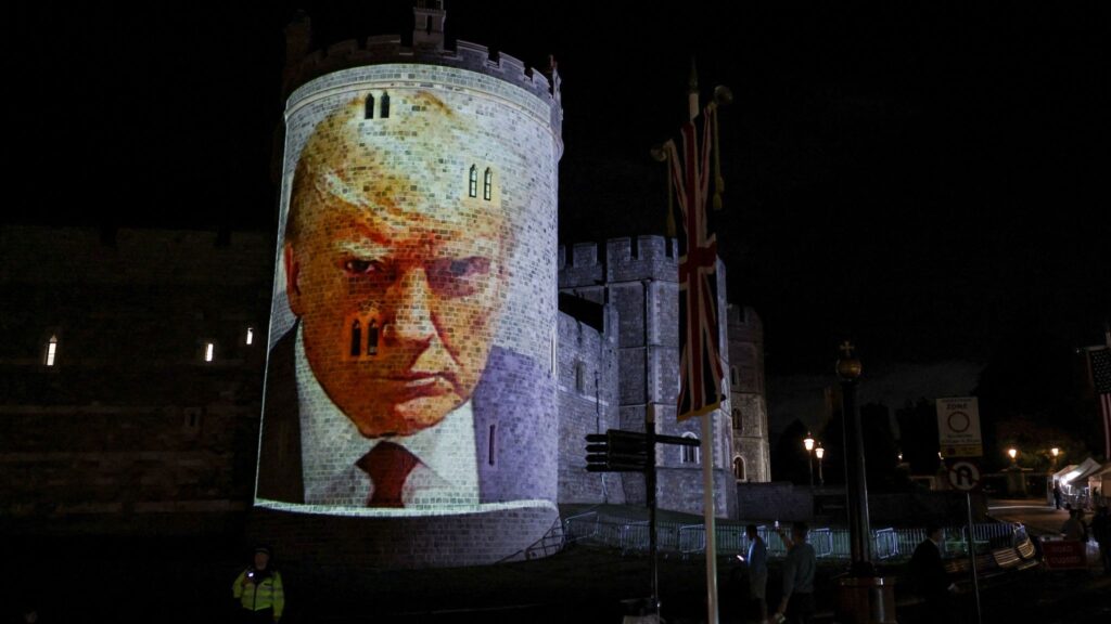 Καθώς όμως κατευθυνόταν προς την κατοικία του Αμερικανού πρέσβη στο κεντρικό Λονδίνο για να διανυκτερεύσει εκεί την Τρίτη, διαδηλωτές πρόβαλαν γιγαντοεικόνες του Τραμπ μαζί με τον παιδόφιλο Τζέφρι Έπσταϊν στο Κάστρο του Ουίνδσορ.