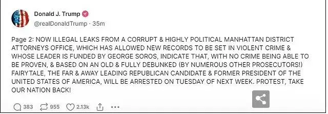 Ο Τραμπ επέμεινε και πάλι ότι δεν είχε διαπράξει κανένα έγκλημα και υπενθύμισε στους οπαδούς του ότι η εκστρατεία εναντίον του είχε χρηματοδοτηθεί σε μεγάλο βαθμό από τον φιλελεύθερο δισεκατομμυριούχο Τζορτζ Σόρος. Καλεί μάλιστα τους οπαδούς του να τον στηρίξουν για να «πάρουν πίσω το έθνος». Εάν οι ισχυρισμοί του Τραμπ είναι αληθινοί, θα γίνει ο πρώτος πρώην πρόεδρος των ΗΠΑ που αντιμετωπίζει ποινικές διώξεις.