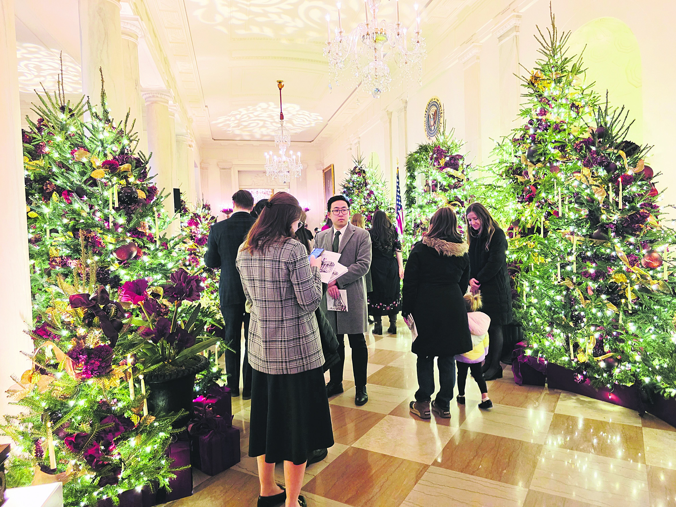 Στην έξοδο, άλλες εργαζόμενες στην προεδρική κατοικία, με μπλε ποδιές και καλάθια στα χέρια, μοιράζουν σοκολατάκια στους επισκέπτες πριν ξαναβγούν στην Ουάσιγκτον, που παγώνει αυτήν την περίοδο σε αρνητικές θερμοκρασίες. Ωστόσο, όλοι οι επισκέπτες κοντοστέκονται για μία ακόμα φωτογραφία στον εξωτερικό χώρο με φόντο το εμβληματικό λευκό κτίριο, που δείχνει ακόμα πιο εντυπωσιακό με τα μεγάλα κόκκινα στεφάνια στα παράθυρα.