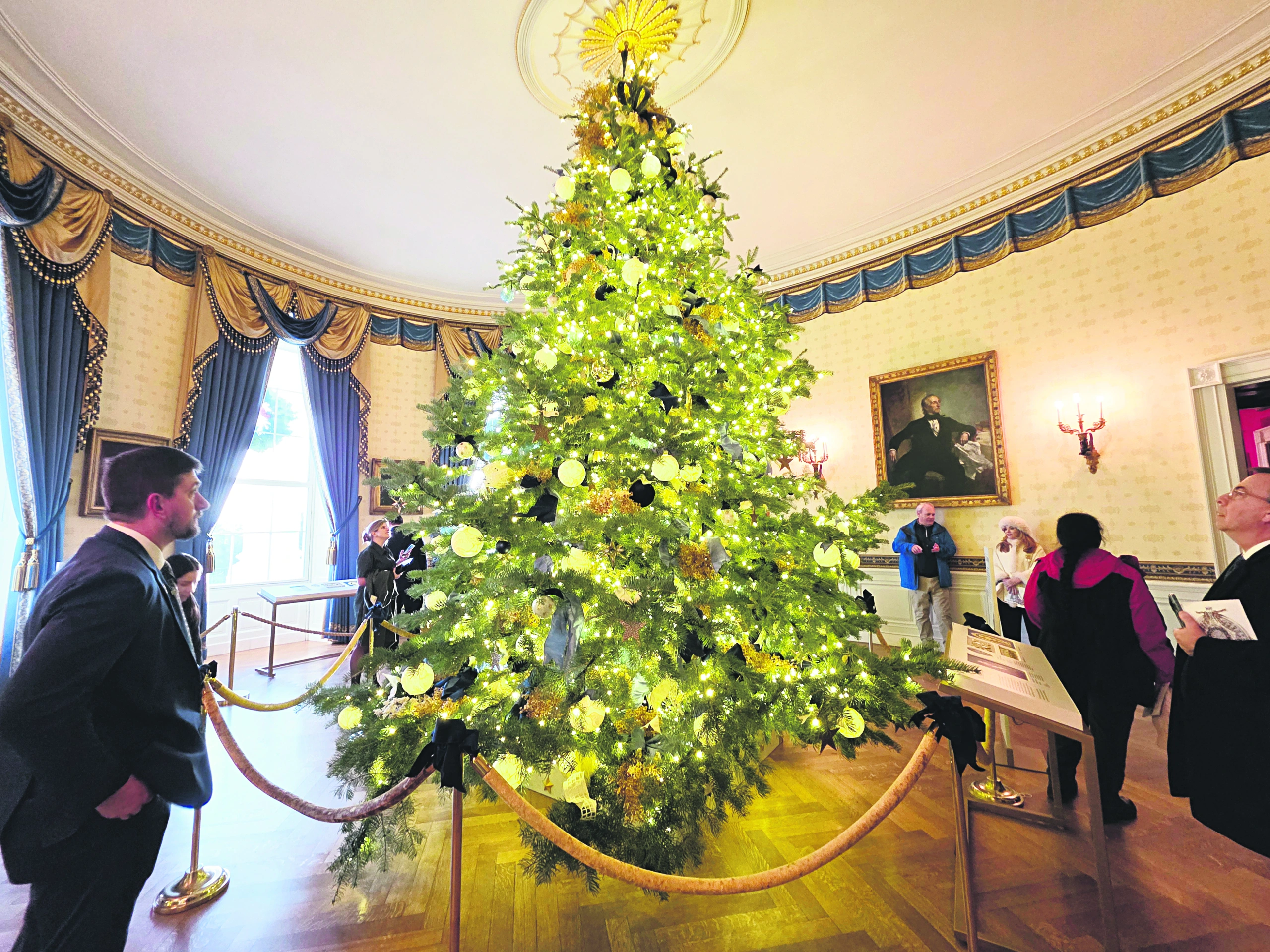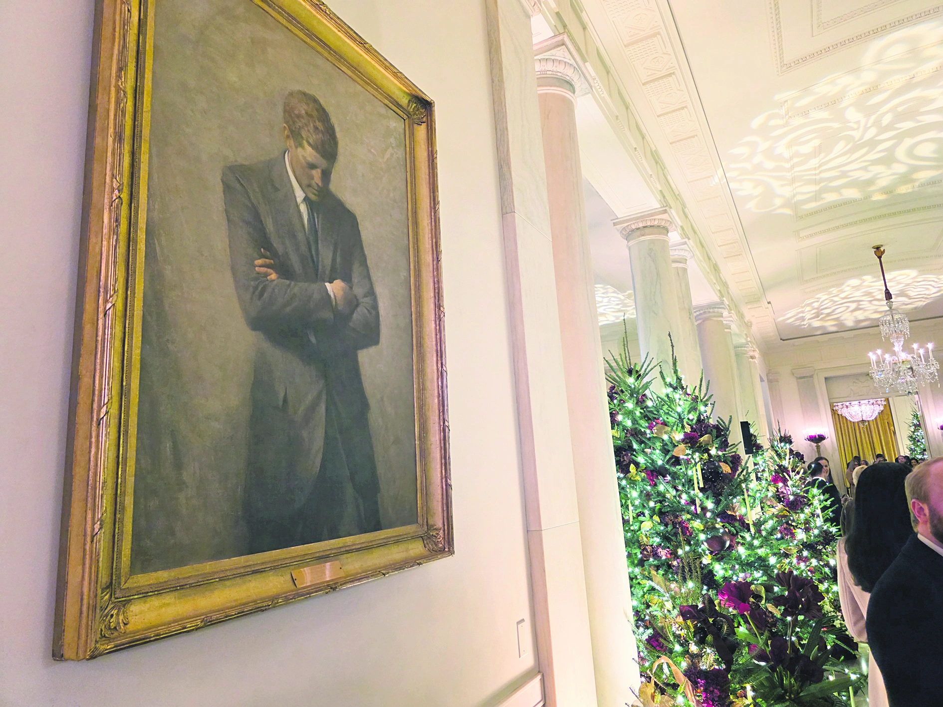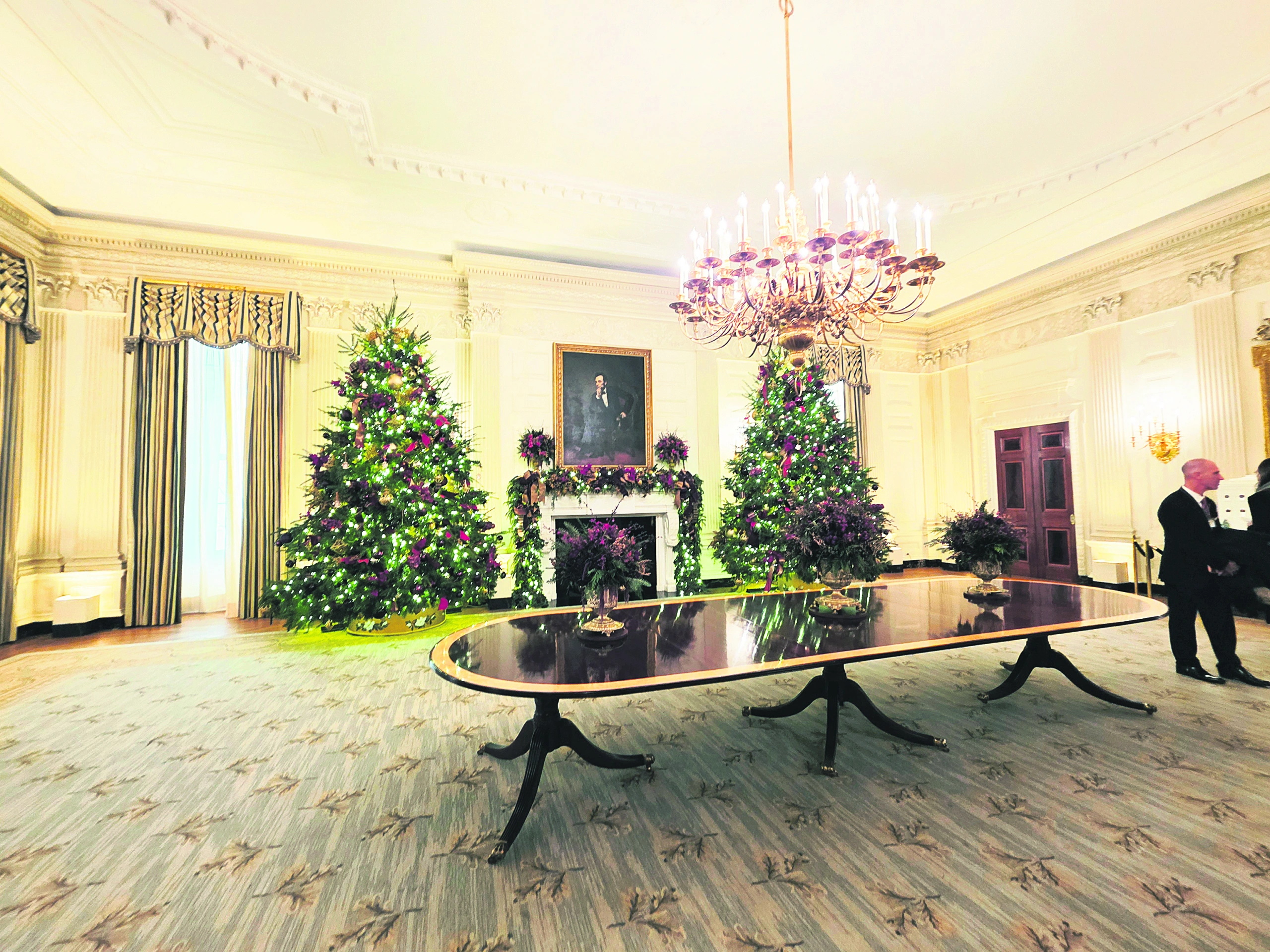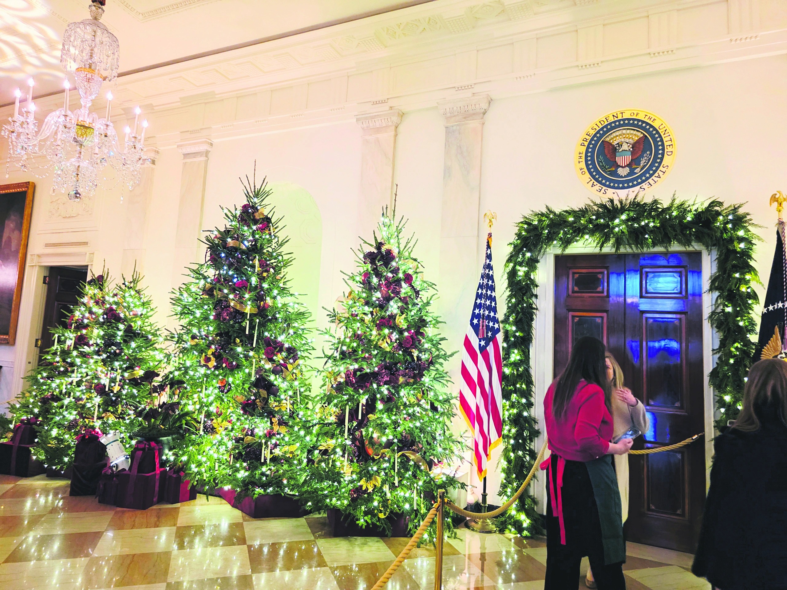 Στην αίθουσα που το μακρινό 1964 ο τότε πρόεδρος των Ηνωμένων Πολιτειών, Λίντον Τζόνσον, υπέγραψε τον νόμο για τα πολιτικά δικαιώματα, ο στολισμός έχει τα χρώματα της αμερικανικής σημαίας, λευκό, μπλε και κόκκινο. Ενα δάσος από έλατα έχει στολιστεί σε όλη τη διαδρομή που η εθιμοτυπία έχει επιλέξει να είναι επισκέψιμη για τους προσκεκλημένους στο επιβλητικό κτίριο, όπου έχουν γραφτεί σημαντικά κεφάλαια της αμερικανικής Ιστορίας.