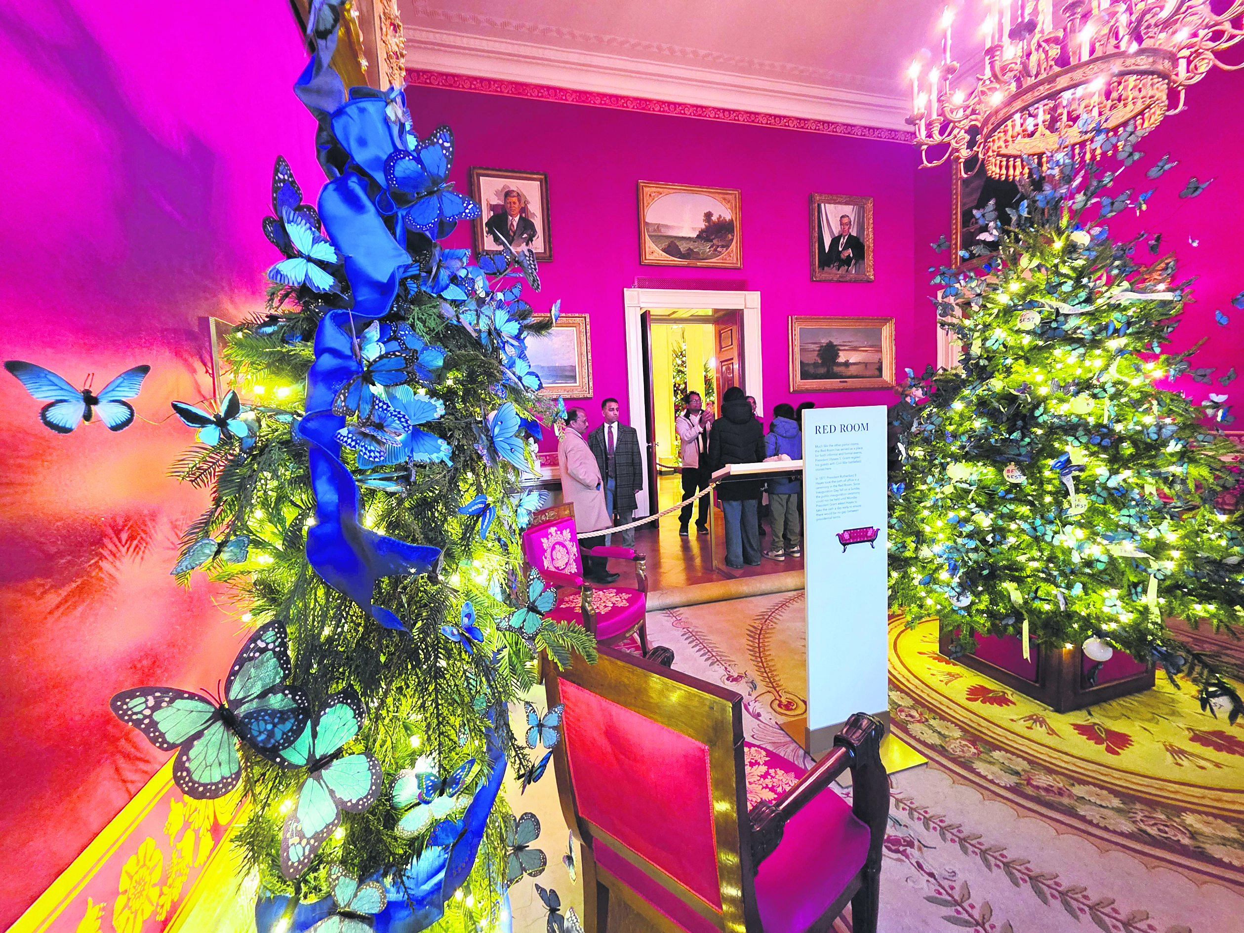 Την πιο ιδιαίτερη χριστουγεννιάτικη διακόσμηση, ωστόσο, τη συναντάμε στο «red room» («κόκκινο δωμάτιο»), που είναι στολισμένο με περισσότερες από 10.000 γαλάζιες πεταλούδες, αφιερωμένο στη νεολαία που εκπροσωπεί το μέλλον της χώρας. Ο διάκοσμος, που είναι ίδιος στο κεντρικό δέντρο, στα στεφάνια που έχουν τοποθετηθεί στα παράθυρα του δωματίου με θέα τον κήπο, αλλά και στις γιρλάντες, επελέγη προς τιμήν της Μελάνια Τραμπ για την αφοσίωσή της στο μέλλον των παιδιών και τις ευκαιρίες που πρέπει να έχουν, ώστε να αξιοποιήσουν τις δυνατότητές τους.