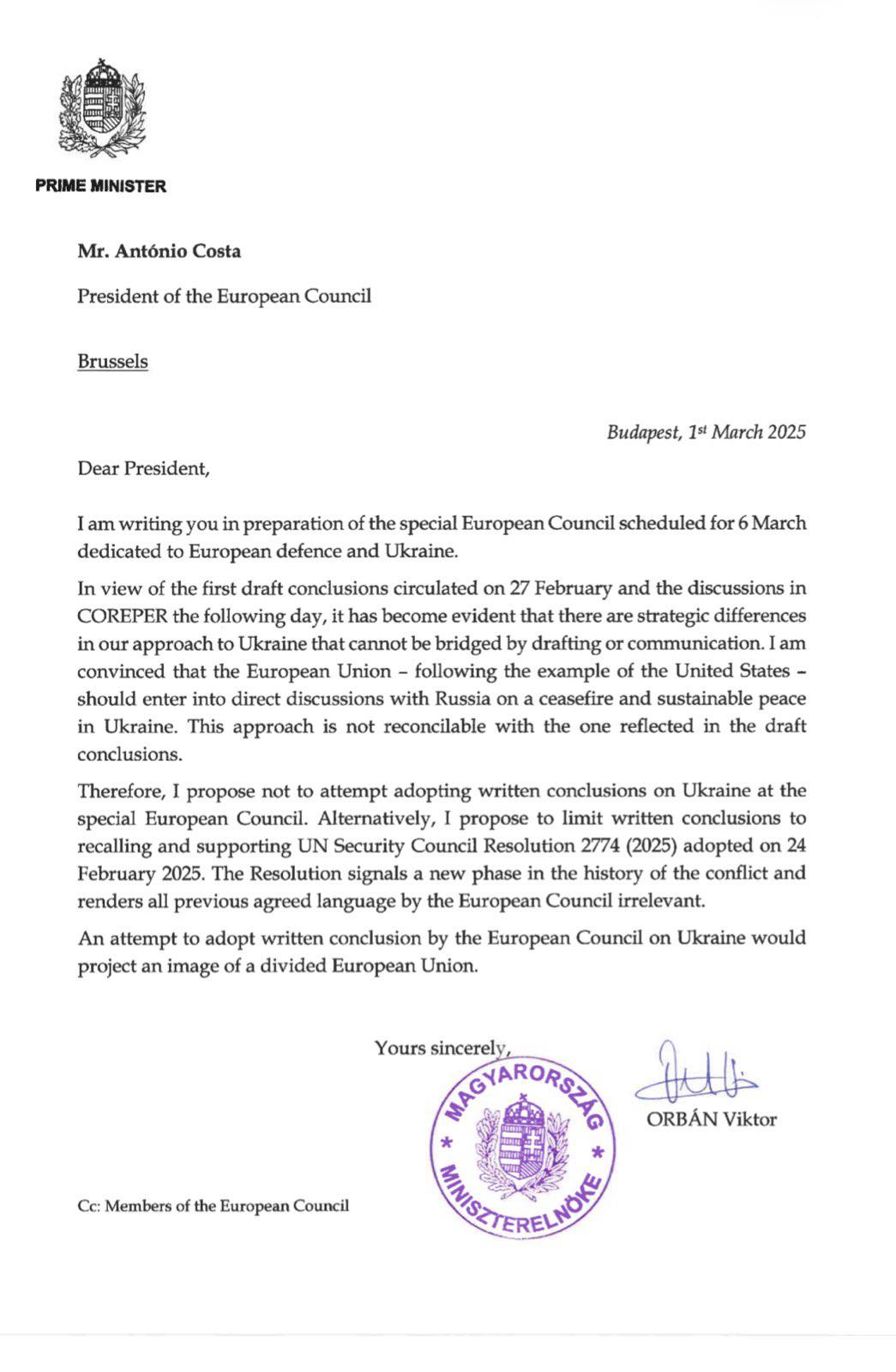 «Είμαι πεπεισμένος ότι η Ευρωπαϊκή Ένωση – ακολουθώντας το παράδειγμα των Ηνωμένων Πολιτειών – θα πρέπει να ξεκινήσει απευθείας συζητήσεις με τη Ρωσία για την κατάπαυση του πυρός και τη βιώσιμη ειρήνη στην Ουκρανία», ανέφερε στην επιστολή ο Όρμπαν.