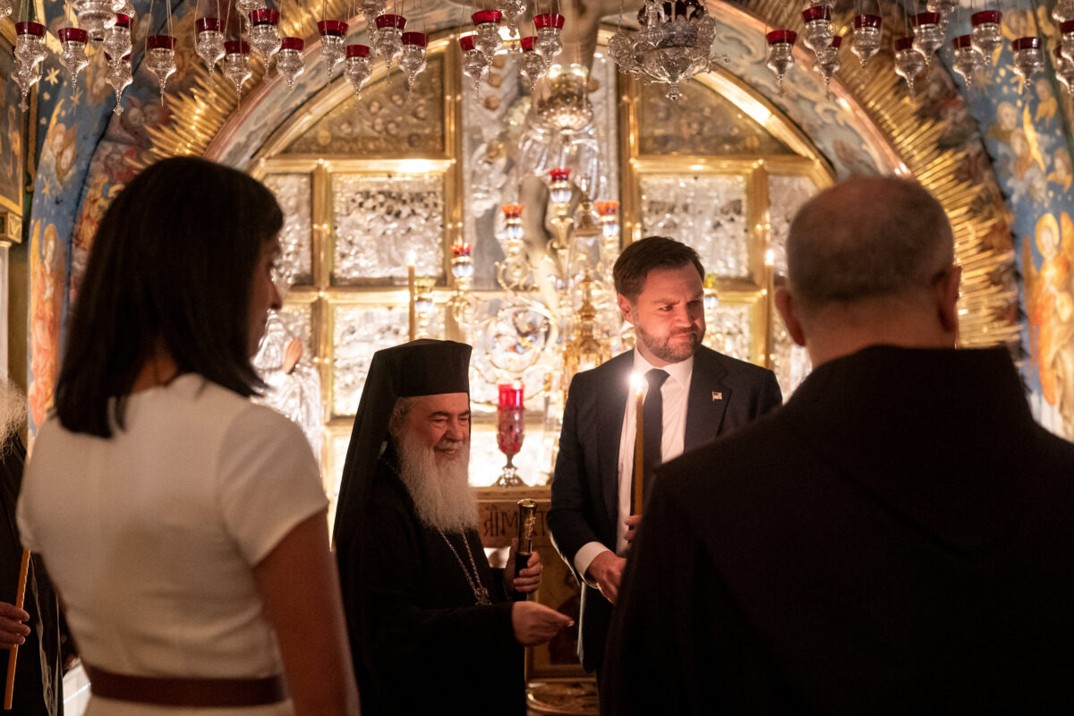 Κατά τη διάρκεια της επίσκεψης, ο Μακαριώτατος ξενάγησε το ζεύγος στους ιερούς χώρους της εκκλησίας, επισημαίνοντας τη σπουδαιότητα του Ναού ως τόπο Σταύρωσης και Αναστάσεως του Χριστού για ολόκληρη τη Χριστιανοσύνη.
