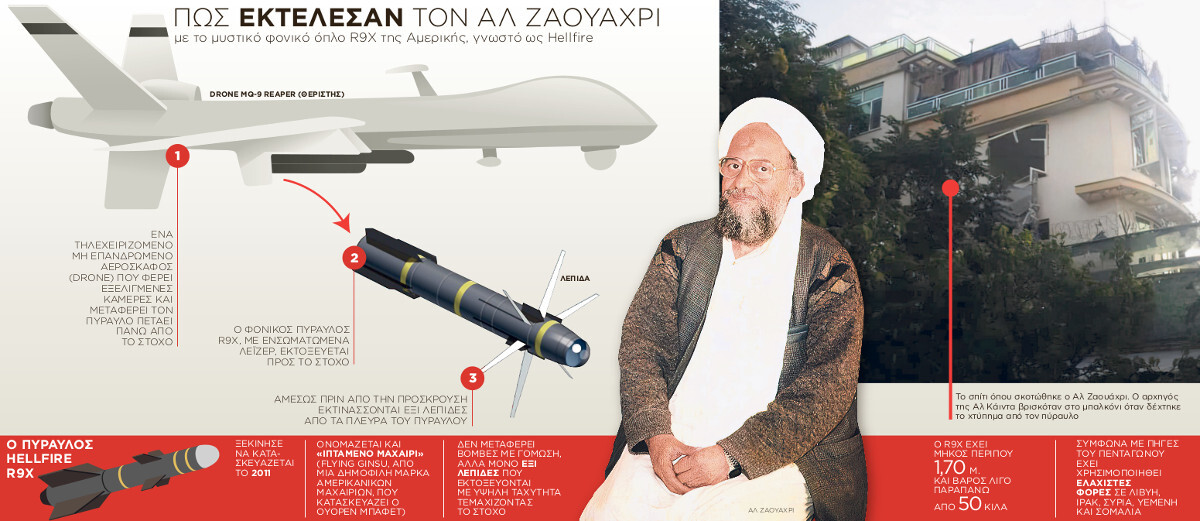 Σύμφωνα με το πρακτορείο Reuters, oι πύραυλοι Hellfire κατασκευάζονται κυρίως από τη Lockheed Martin και θεωρούνται όπλα υψίστης ακριβείας, η χρήση των οποίων καλύπτεται από πέπλο μυστικότητας από τις αμερικανικές Ενοπλες Δυνάμεις. Είναι χαρακτηριστικό ότι οι Αμερικανοί απέφυγαν κατ’ αρχάς να τους ταυτοποιήσουν επίσημα στην επιχείρηση εκτέλεσης του Αϊμάν αλ Ζαουάχρι, στο μπαλκόνι του σπιτιού του στην Καμπούλ, το σούρουπο της 31ης Ιουλίου. Οι ελάχιστες, όμως, υλικές ζημιές που προκάλεσαν τα δύο εκτοξευθέντα βλήματα άφησαν ουσιαστικά το αποτύπωμά τους.