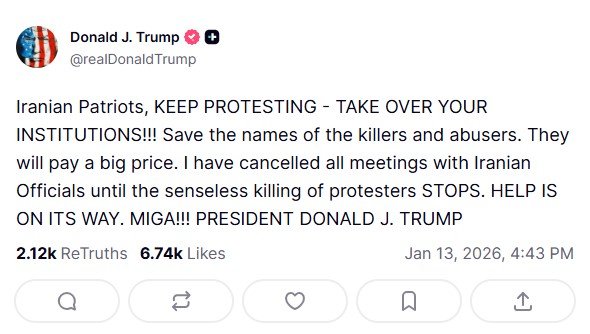 «Ιρανοί Πατριώτες, ΣΥΝΕΧΙΣΤΕ ΝΑ ΔΙΑΜΑΡΤΥΡΕΥΕΣΤΕ – ΑΝΑΛΑΒΕΤΕ ΤΟΥΣ ΘΕΣΜΟΥΣ ΣΑΣ!!!» έγραψε ο Τραμπ στο Truth Social. «Ας φυλάξουμε τα ονόματα των δολοφόνων και των κακοποιών. Θα πληρώσουν ακριβά. Έχω ακυρώσει όλες τις συναντήσεις με Ιρανούς αξιωματούχους μέχρι να ΣΤΑΜΑΤΗΣΕΙ η άσκοπη δολοφονία διαδηλωτών. Η βοήθεια έρχεται. MIGA!!!», έγραψε χαρακτηριστικά.