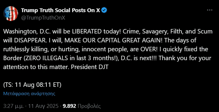 Σε ανάρτησή του στο Truth Social, ανέφερε: «Η Ουάσιγκτον θα ΑΠΕΛΕΥΘΕΡΩΘΕΙ σήμερα! Το έγκλημα, η βαρβαρότητα, η βρωμιά και τα αποβράσματα θα ΕΞΑΦΑΝΙΣΤΟΥΝ. Θα ΚΑΝΩ ΤΗΝ ΠΡΩΤΕΥΟΥΣΑ ΜΑΣ ΠΟΛΗ ΜΕΓΑΛΗ ΞΑΝΑ! Οι μέρες των αδίστακτων δολοφονιών και των τραυματισμών αθώων ανθρώπων έχουν ΤΕΛΕΙΩΣΕΙ! Έφτιαξα γρήγορα τα σύνορα (ΜΗΔΕΝ ΠΑΡΑΝΟΜΟΙ τους τελευταίους 3 μήνες!), η Ουάσιγκτον είναι η επόμενη!!!», θεωρώντας ότι η κατάσταση είναι «εντελώς εκτός ελέγχου».