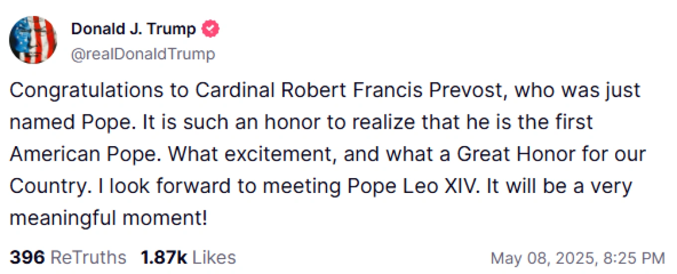 «Συγχαρητήρια στον καρδινάλιο Ρόμπερτ Φράνσις Πρέβοστ, ο οποίος μόλις ορίστηκε Πάπας. Είναι μεγάλη τιμή να συνειδητοποιούμε ότι είναι ο πρώτος Αμερικανός Πάπας. Τι συγκίνηση και τι μεγάλη τιμή για τη χώρα μας. Ανυπομονώ να συναντήσω τον Πάπα Λέοντα XIV. Θα είναι μια πολύ σημαντική στιγμή!», έγραψε ο Αμερικανός πρόεδρος σε ανάρτησή του στην πλατφόρμα Truth Social.