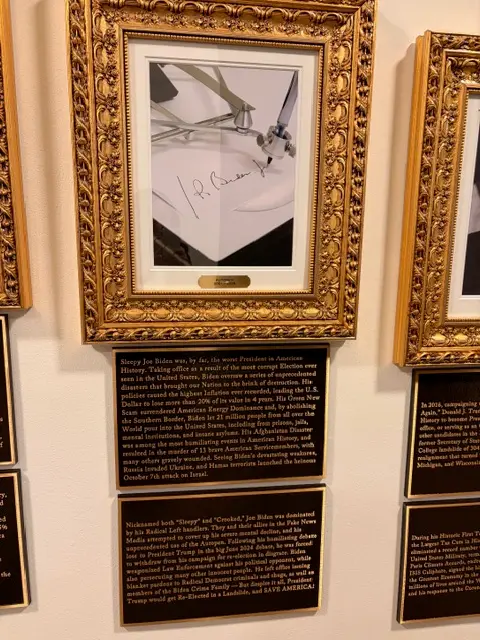 Τοποθετημένος ανάμεσα στα πορτρέτα του Τραμπ, περιγράφεται ως «Sleepy Joe Biden … μακράν ο χειρότερος Πρόεδρος στην Ιστορία των ΗΠΑ» σε δύο πρόσφατα τοποθετημένες μπρούντζινες πλάκες κάτω από την εικόνα του autopen.