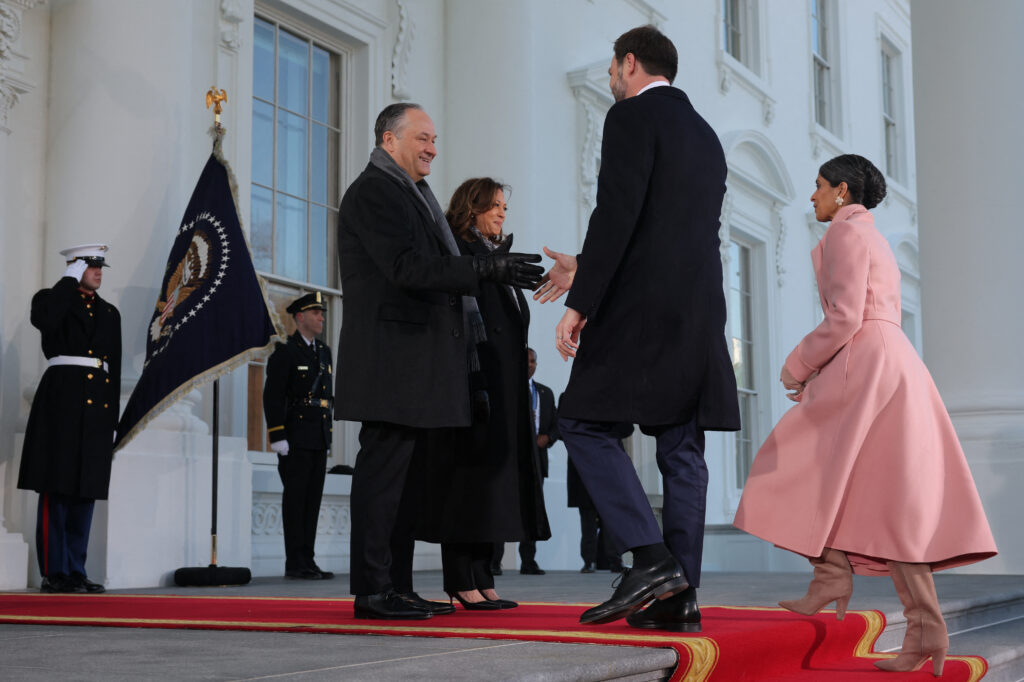 Λίγο πριν τις 17:00 το απόγευμα της Δευτέρας η αντιπρόεδρος Κάμαλα Χάρις και ο σύζυγός της, Νταγκ Έμχοφ υποδέχθηκαν τον εκλεγμένο αντιπρόεδρο Τζέι Ντι Βανς και τη σύζυγό του, Ούσα στον Λευκό Οίκο μετά από τη λειτουργία στην επισκοπική εκκλησία του Αγίου Ιωάννη.