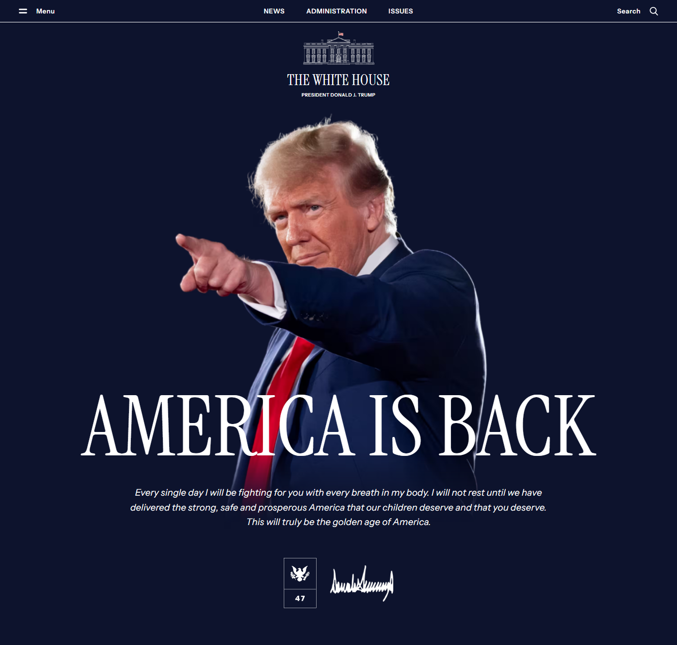 O Ντόναλντ Τραμπ ορκίστηκε 47ος πρόεδρος της Αμερικής και η επίσημη ιστοσελίδα του Λευκού Οίκου, απέκτησε νέα διάταξη με τον Τραμπ να βρίσκεται στο φόντο.
