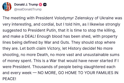 Αυτό έρχεται μετά την χθεσινή δήλωση του Ζελένσκι και των συμμάχων του στον λεγόμενο συνασπισμό των προθύμων ότι «υποστηρίζουν σθεναρά» τη θέση του Τραμπ ότι οι μάχες πρέπει να σταματήσουν αμέσως και ότι «η τρέχουσα γραμμή επαφής θα πρέπει να είναι το σημείο εκκίνησης των διαπραγματεύσεων».
