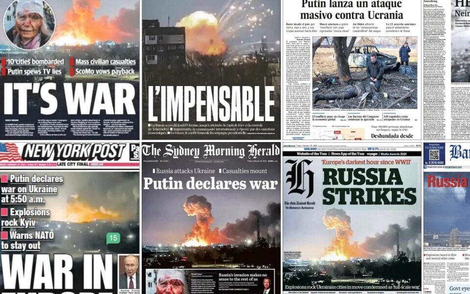 Ο κόσμος ξυπνά με τις ιαχές του πολέμου. Τα διεθνή πρωτοσέλιδα έχουν ένα μείγμα σοκ, απόγνωσης, φόβου και θυμού.