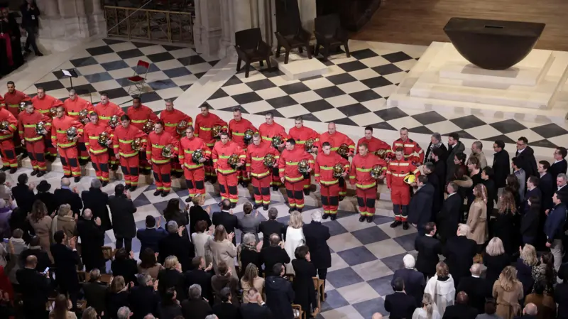 “Ανακαλύψαμε ξανά τι μπορούν να κάνουν τα μεγάλα έθνη: να υλοποιήσουν το αδύνατο”, χαιρέτισε ο Γάλλος πρόεδρος μέσα στον καθεδρικό ναό, που ξαναχτίστηκε μέσα σε πέντε χρόνια μετά την καταστροφή που υπέστη από πυρκαγιά τον Απρίλιο του 2019.