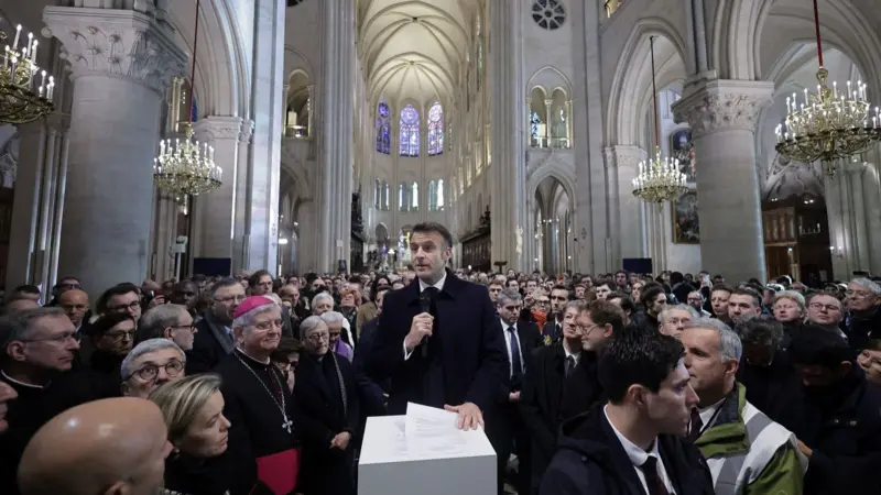 “Στέκομαι μπροστά σας για να εκφράσω την ευγνωμοσύνη του γαλλικού έθνους, την ευγνωμοσύνη μας σε όλους όσους έσωσαν, βοήθησαν και ανοικοδόμησαν τον καθεδρικό ναό”, δήλωσε ο Γάλλος πρόεδρος