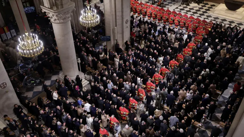 Λίγο νωρίτερα, ο Γάλλος πρόεδρος είχε υποδεχθεί θερμά μπροστά από τον καθεδρικό ναό αρχηγούς κρατών και κυβερνήσεων, εστεμμένους και εξέχουσες προσωπικότητες.