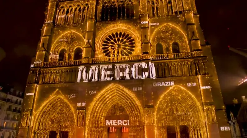 Στη συνέχεια, προβλήθηκε ένα εντυπωσιακό βίντεο με ρυθμούς σαν τρέιλερ ταινίας για την πυρκαγιά του 2019 και την αποκατάσταση του καθεδρικού ναού, το οποίο τελείωσε με εκκωφαντικά χειροκροτήματα για τους εργάτες που συνέβαλαν στην προσπάθεια.