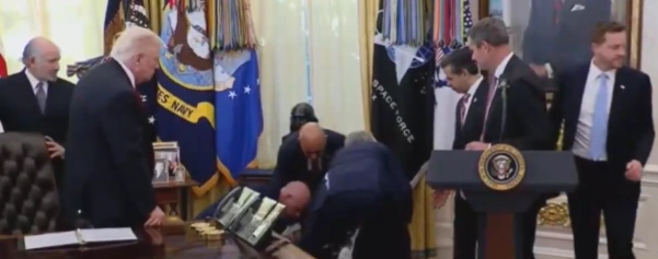 Ενώ ο διευθύνων σύμβουλος της Eli Lilly, Ντέιβιντ Ριξ, έκανε τις σχετικές ανακοινώσεις σε ζωντανή μετάδοση, ο φακός κατέγραψε μια απρόσμενη στιγμή: ο Γκόρντον Φίντλεϊ, υψηλόβαθμο στέλεχος της Novo Nordisk, έχασε τις αισθήσεις του και κατέρρευσε δίπλα στον Αμερικανό πρόεδρο, προκαλώντας αναστάτωση στην αίθουσα.