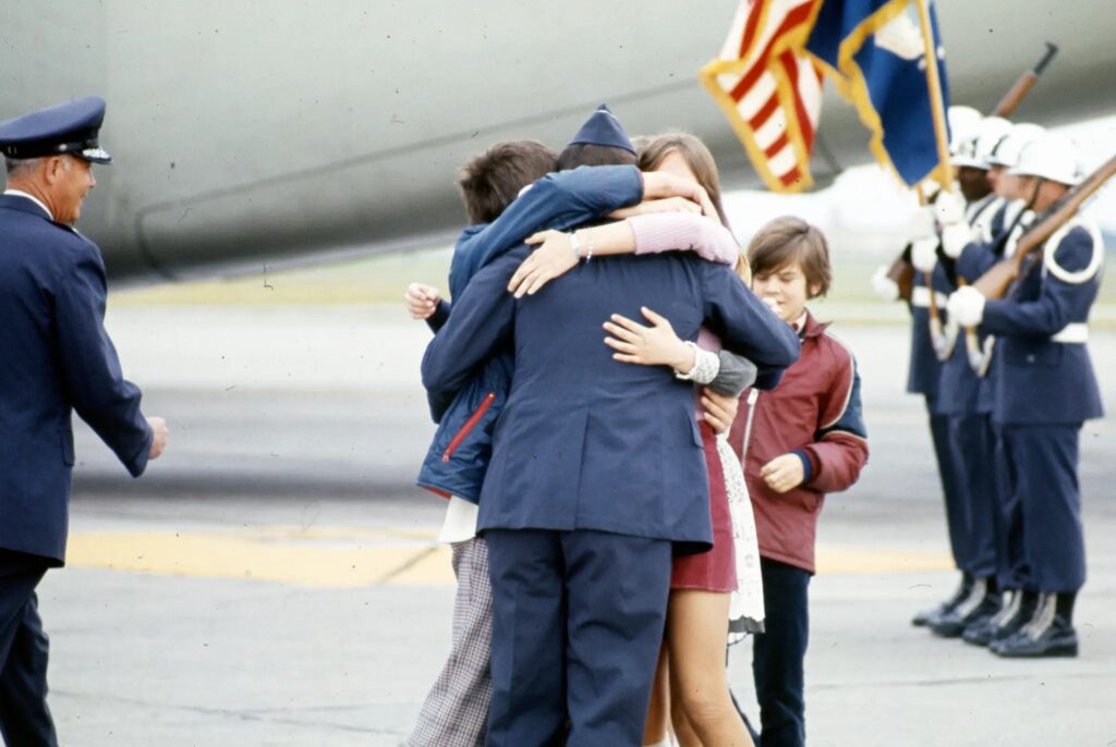 Η θρυλική ασπρόμαυρη φωτογραφία του 1973 από τον φωτογράφο της Associated Press, Sal Veder, δείχνει τον Στρατηγό Stirm, τότε 39 ετών, λίγα δευτερόλεπτα πριν αγκαλιάσει τη γυναίκα και τα παιδιά του στο αεροδρόμιο Travis Air Force Base στην Καλιφόρνια, με χαμόγελα από αυτί σε αυτί και τεντωμένα χέρια.