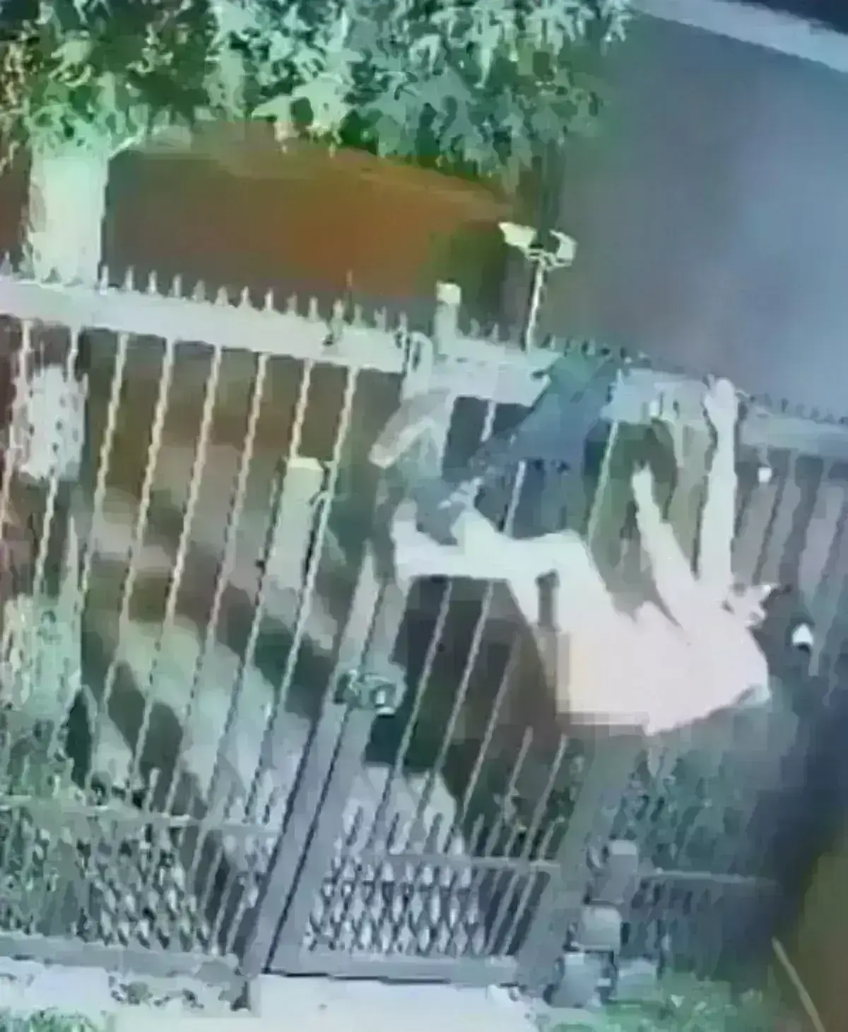 Η επίδοξη κλέφτης του αυτοκινήτου τα έβγαλε όλα αφού το κάτω μέρος της πιάστηκε πάνω σε μεταλλικές πύλες πάνω από τις οποίες έτρεχε. Η γυναίκα σκαρφάλωσε από τον φράχτη και λίγο πριν πέσει από την κορυφή, η φόρμα της φαίνεται να κόλλησε σε σιδερένιες ακίδες και γλίστρησε.