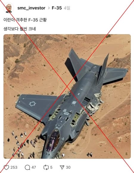 Μια ψεύτικη εικόνα έδειχνε ένα κατεστραμμένο ισραηλινό μαχητικό F-35, το οποίο ήταν στην πραγματικότητα μια κατασκευή δημιουργημένη με τεχνητή νοημοσύνη (AI). Υπήρχαν επίσης ισχυρισμοί για ένα «εξαφανισμένο αεροδρόμιο» και έναν φανταστικό Star Wars Star Destroyer κάτω από το Τελ Αβίβ.