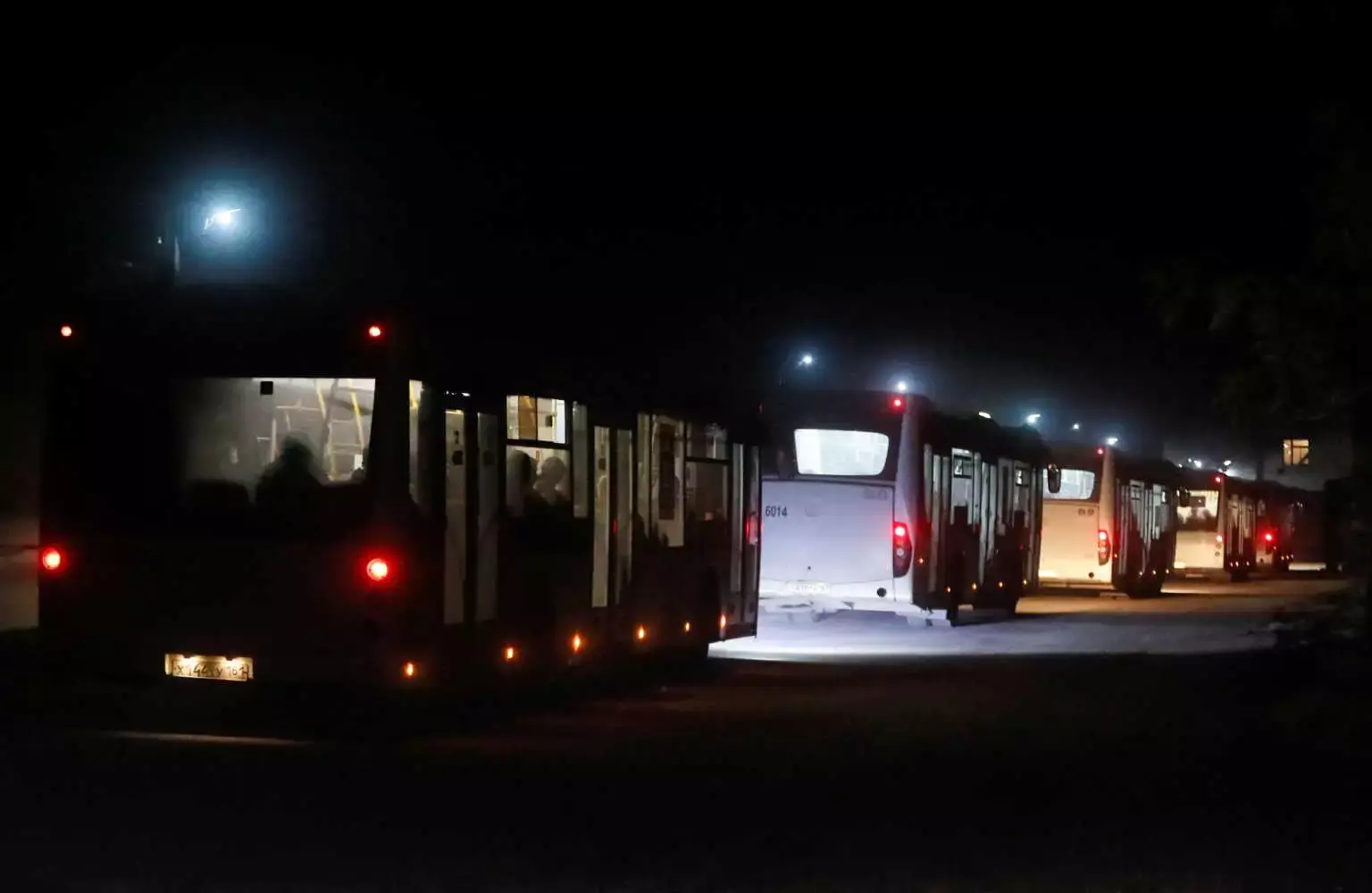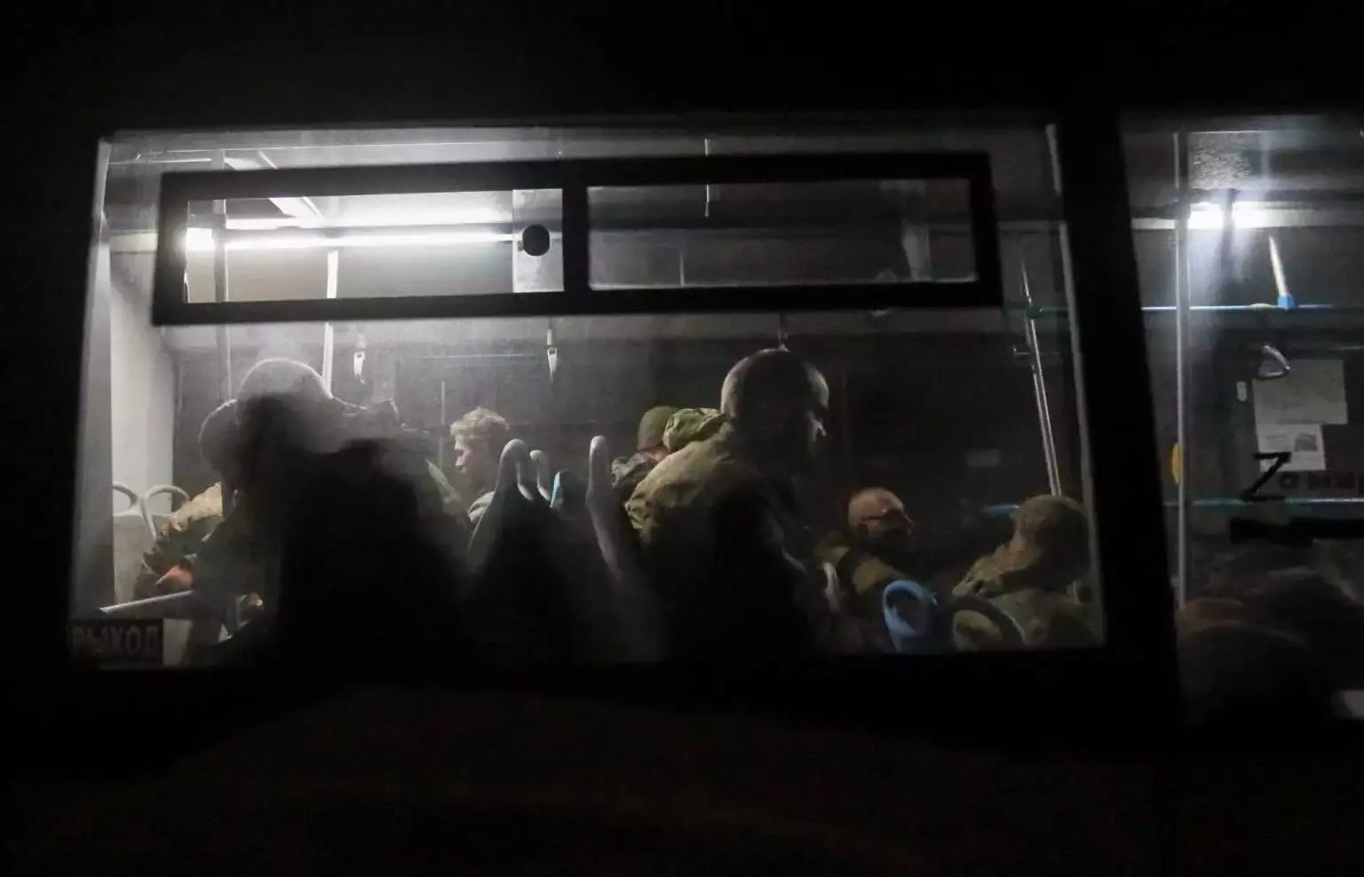 Η στιγμή που λεωφορεία γεμάτα Ουκρανούς μαχητές φτάνουν, υπό τη συνοδεία φιλορώσων αυτονομιστών, στον οικισμό Ολενίβκα στην περιοχή του Ντονέτσκ: