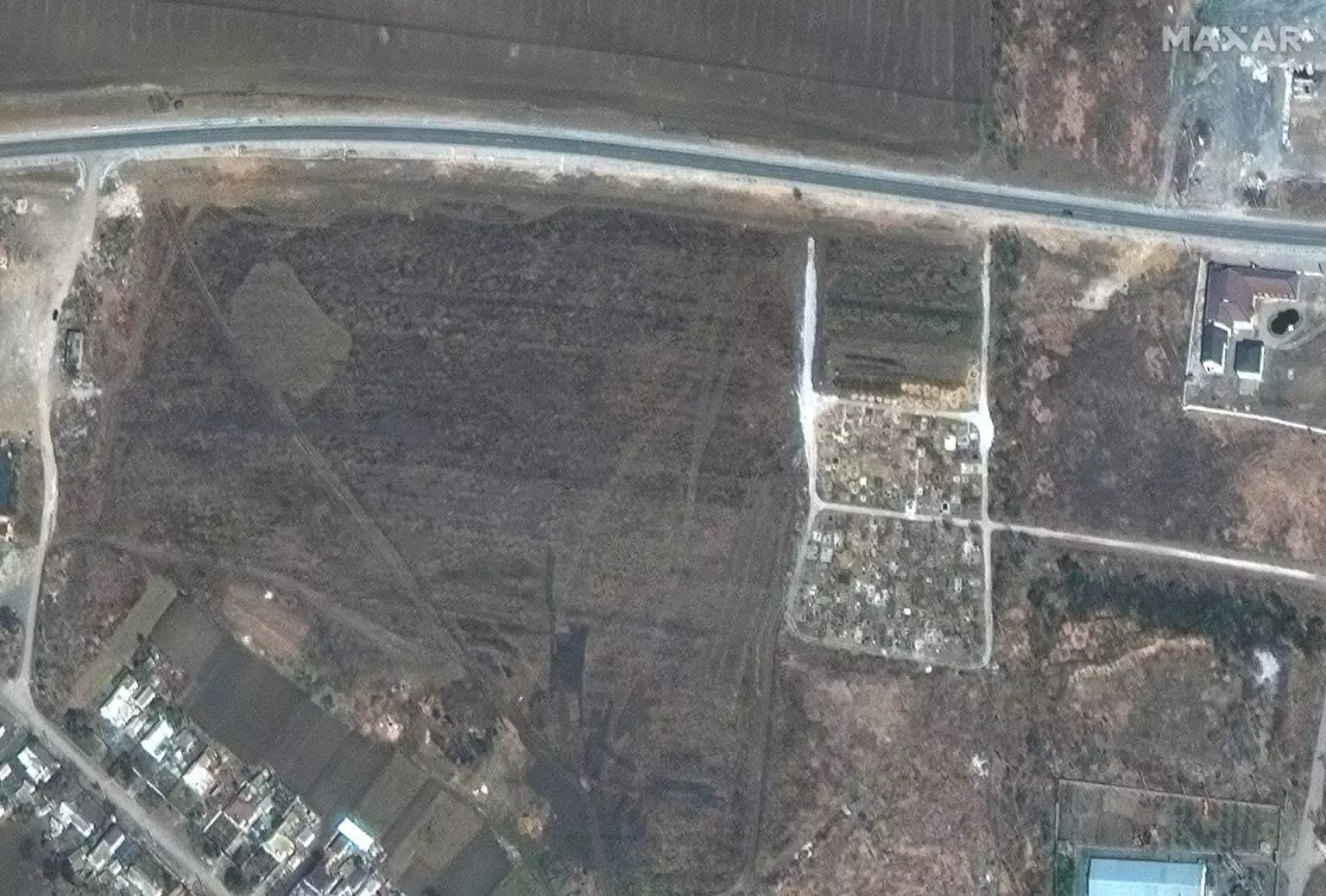 Ο χώρος βρίσκεται δίπλα σε ένα υπάρχον νεκροταφείο στο χωριό Μάνχους, σε απόσταση 20 χιλιομέτρων δυτικά της Μαριούπολης, σύμφωνα με τη Maxar.