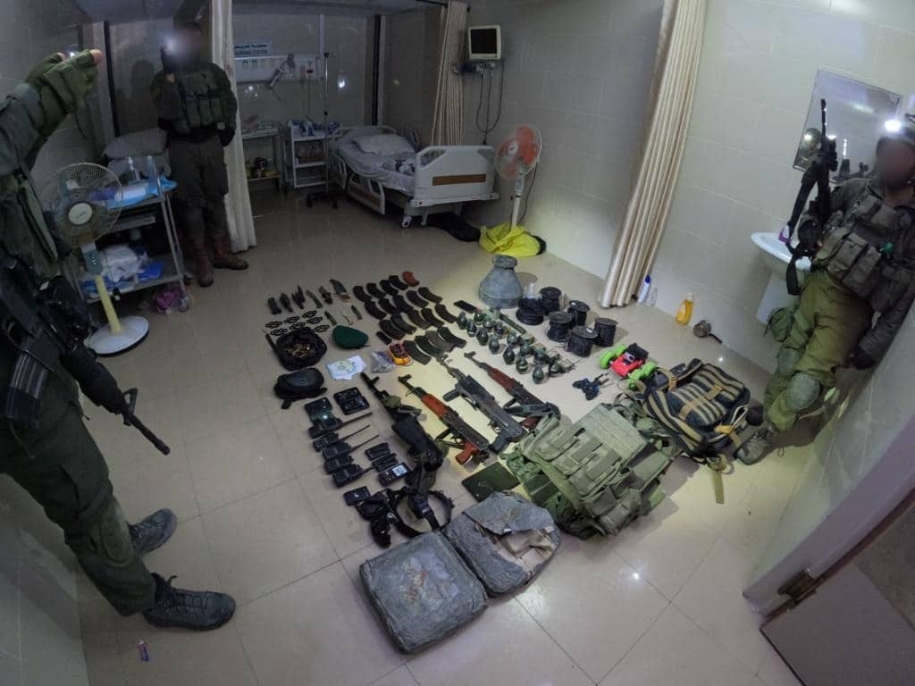 Ο στρατός δίνει επίσης στη δημοσιότητα μια εικόνα που δείχνει όπλα που ανακαλύφθηκαν από τα στρατεύματα μέσα στο νοσοκομείο Αλ Γκουντς της πόλης της Γάζας.