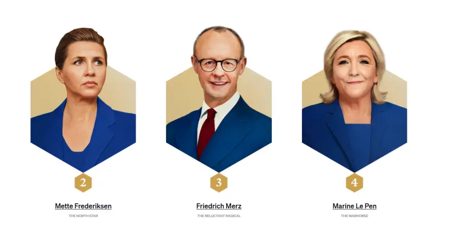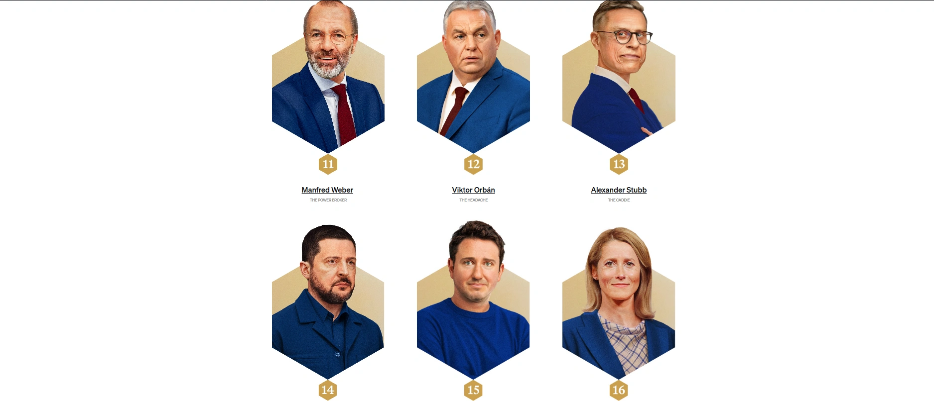 Η λίστα περιλαμβάνει ηγέτες κρατών, επικεφαλής ευρωπαϊκών θεσμών, αλλά και προσωπικότητες από την οικονομία και τον αθλητισμό, που θεωρούνται κρίσιμες για τη διαμόρφωση της ευρωπαϊκής πολιτικής πραγματικότητας. Μεταξύ άλλων, στην κατάταξη περιλαμβάνονται οι Ναίτζελ Φάρατζ, Ούρσουλα φον ντερ Λάιεν, Μαρκ Ρούτε, Τζόρτζια Μελόνι και Κιρ Στάρμερ.