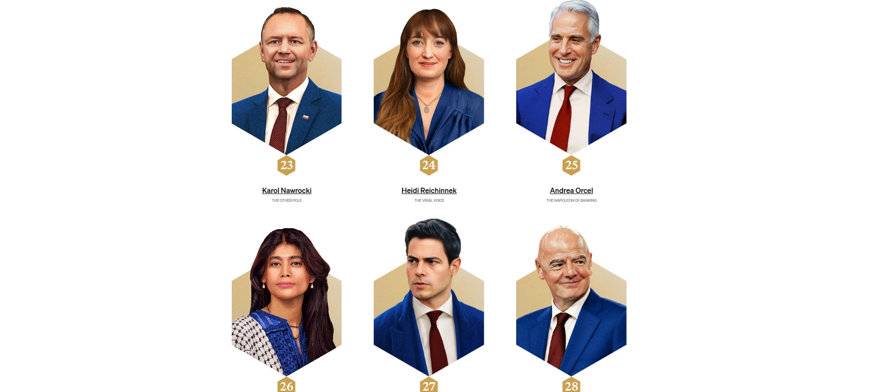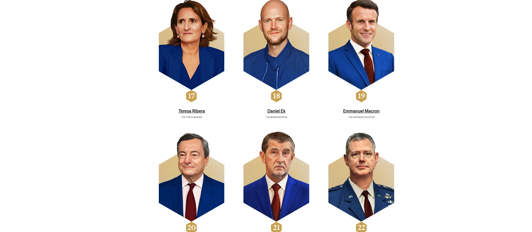 Ακολουθούν ο Μάνφρεντ Βέμπερ, Βίκτορ Όρμπαν, Αλεξάντερ Στουμπ, Βολοντίμιρ Ζελένσκι, καθώς και προσωπικότητες όπως ο Γκαμπριέλ Ζουκμάν, η Κάγια Κάλας, η Τερέζα Ριμπέρα, ο Ντάνιελ Εκ, ο Εμανουέλ Μακρόν και ο Μάριο Ντράγκι. Στη λίστα βρίσκονται επίσης ο Αντρέι Μπάμπις, ο Αλέξους Γκρίνκεβιτς, η Κάρολ Ναβρότσκι, η Χάιντι Ράιχινεκ, ο Αντρέα Ορσέλ, η Ρίμα Χασάν, ο Ρομπ Γέτεν και ο πρόεδρος της FIFA Τζάνι Ινφαντίνο.