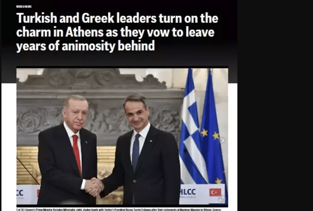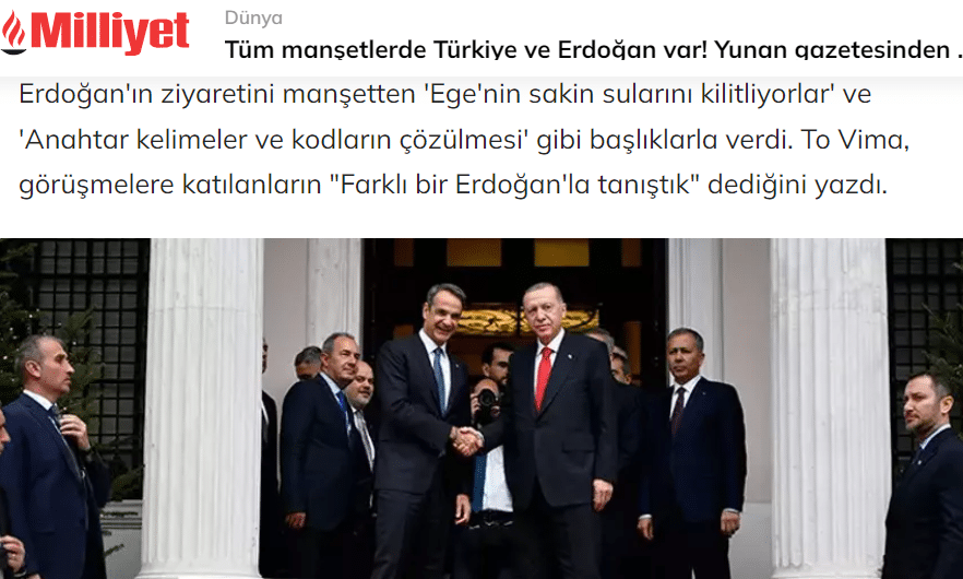 Η εφημερίδα Hurriyet γράφει χαρακτηριστικά: «100 χρόνια μετά τη Λωζάνη ξεκίνησε νέα περίοδος για τις ελληνοτουρκικές σχέσεις. Ερντογάν-Μητσοτάκης καθόρισαν τον οδικό χάρτη», ενώ κάνει ιδιαίτερη αναφορά και στο θέμα της χορήγησης βίζας σε Τούρκους για 10 νησιά του ανατολικού Αιγαίου. Μέχρι και η παρουσία του Πίνατ του «Μεγάρου» δεν έμεινε ασχολίαστη.