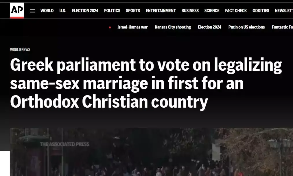 Το πρακτορείο Associated Press κάνει λόγο για μια πρωτοφανή εξέλιξη για μια ορθόδοξη χριστιανική χώρα, η οποία παρά την αντίθεση της ελληνικής εκκλησίας, πρόκειται να ψηφίσει τη νομιμοποίηση του πολιτικού γάμου μεταξύ ατόμων του ιδίου φύλου. Μάλιστα, υπογραμμίζει ότι οι δημοσκοπήσεις δείχνουν ότι οι περισσότεροι Έλληνες υποστηρίζουν την προτεινόμενη μεταρρύθμιση και το ζήτημα δεν έχει προκαλέσει μεγάλους διχασμούς.