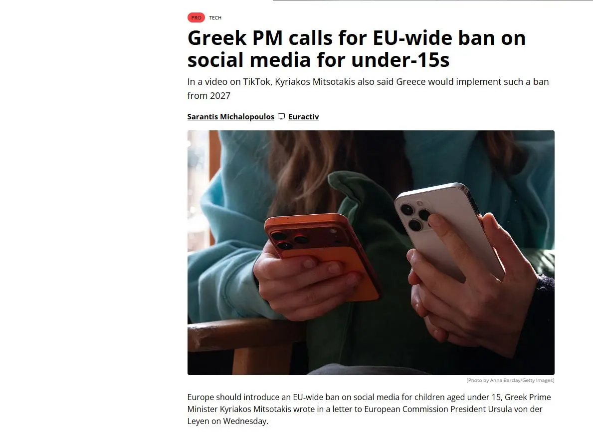 Από την πλευρά του, το Euractiv αποκαλύπτει την πολιτική διάσταση της κίνησης, αναφέροντας την επιστολή του κ. Μητσοτάκη προς την Πρόεδρο της Κομισιόν, Ούρσουλα φον ντερ Λάιεν, με την οποία ζητά μια ενιαία ευρωπαϊκή απαγόρευση. «Ο ρόλος μας δεν είναι να είμαστε δημοφιλείς, αλλά υπεύθυνοι», σημειώνει το Euractiv, αναφερόμενο στην παραδοχή του Πρωθυπουργού ότι η νεολαία ενδεχομένως να αντιδράσει έντονα στην απόφαση αυτή.