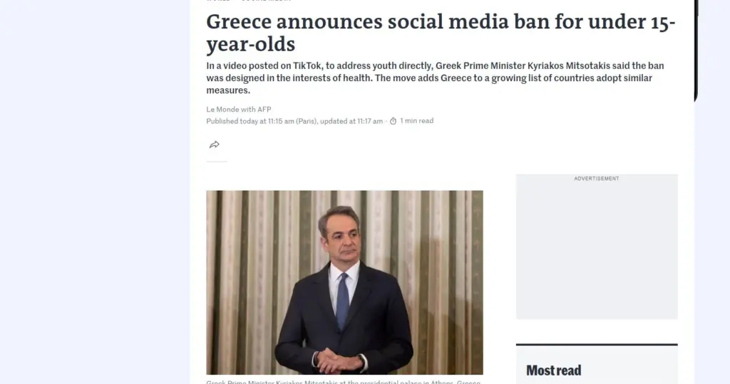 Η γαλλική Le Monde (στην αγγλική της έκδοση) τοποθετεί την ελληνική πρωτοβουλία σε ένα παγκόσμιο πλαίσιο, συγκρίνοντάς την με την Αυστραλία, η οποία τον περασμένο Δεκέμβριο έγινε η πρώτη χώρα που απαίτησε την απομάκρυνση λογαριασμών κάτω των 16 ετών, αλλά και την Ινδονησία. Το δημοσίευμα επισημαίνει ότι η Ελλάδα επιθυμεί να αποτελέσει το «παράδειγμα» για τον υπόλοιπο κόσμο, με το μέτρο να τίθεται σε ισχύ σε λιγότερο από δύο χρόνια.