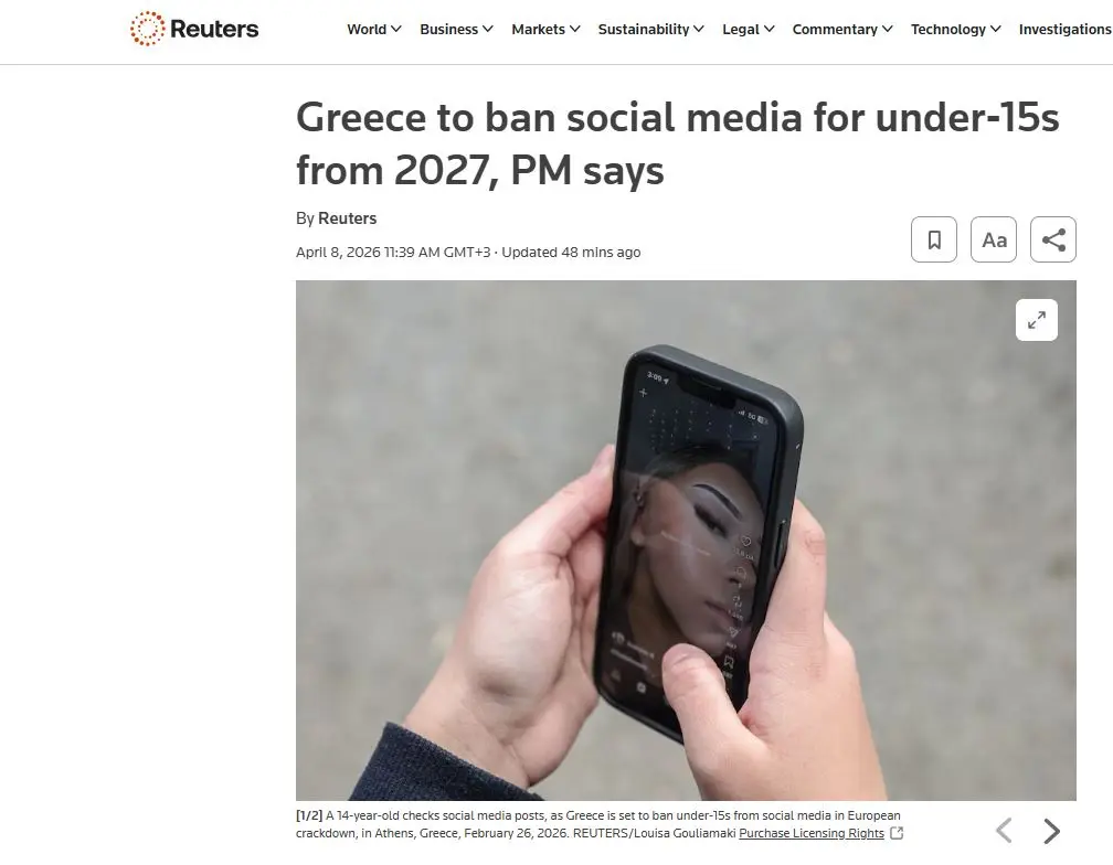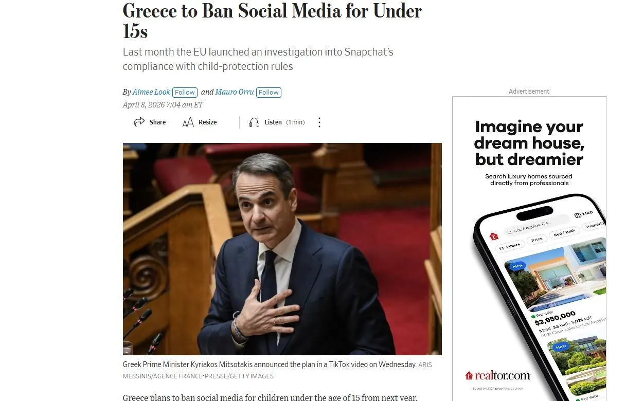 Τέλος, η Wall Street Journal επισημαίνει ότι η Ελλάδα εντάσσεται σε μια διαρκώς αυξανόμενη λίστα χωρών που εξετάζουν αυστηρούς περιορισμούς για την προστασία των ανηλίκων από επιβλαβές περιεχόμενο. Με το νομοσχέδιο να αναμένεται να ψηφιστεί το φετινό καλοκαίρι, η Αθήνα ηγείται πλέον μιας ομάδας ευρωπαϊκών χωρών —όπως η Γαλλία, η Ισπανία και η Γερμανία— που εξετάζουν παρόμοια όρια ηλικίας, μετατρέποντας το ζήτημα της ψηφιακής ασφάλειας των παιδιών σε κορυφαία προτεραιότητα της ευρωπαϊκής ατζέντας.