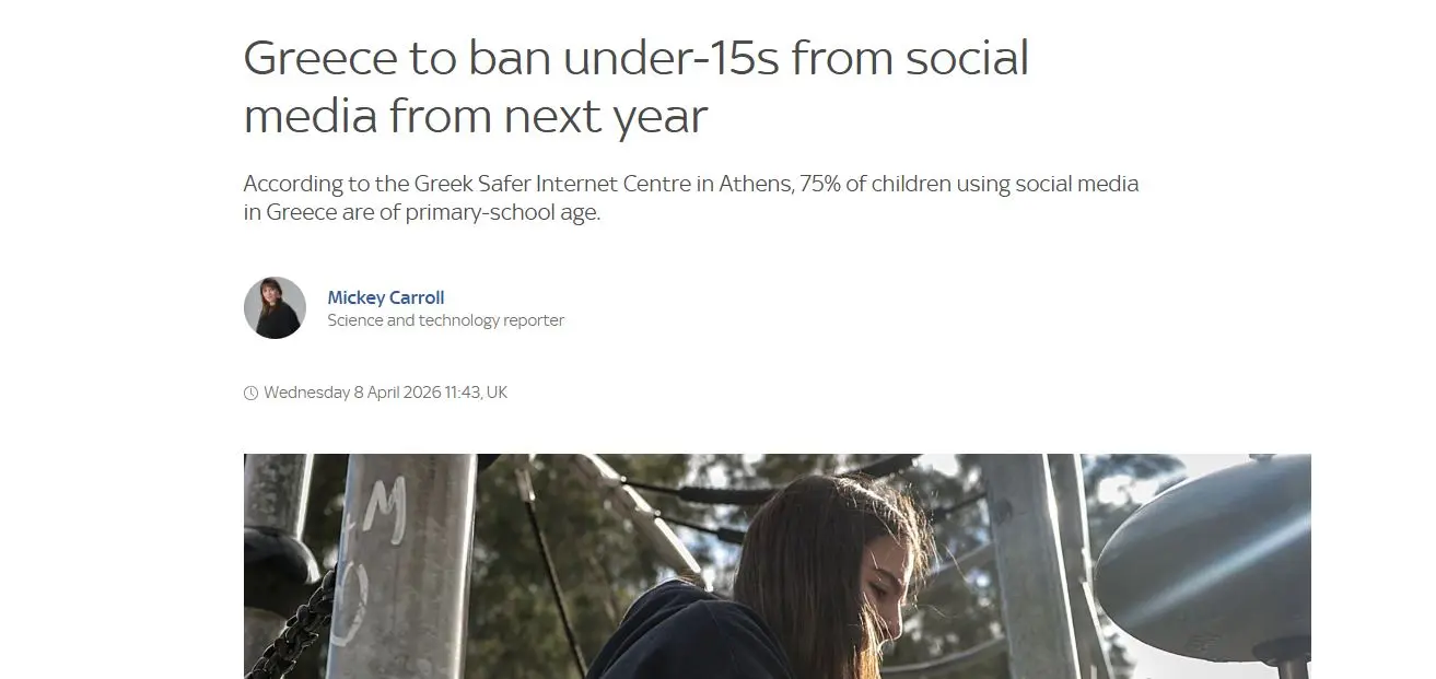 Παράλληλα, το βρετανικό δίκτυο επικαλείται στοιχεία του Ελληνικού Κέντρου Ασφαλούς Διαδικτύου, σύμφωνα με τα οποία το 75% των παιδιών που χρησιμοποιούν social media στην Ελλάδα είναι ηλικίας δημοτικού, γεγονός που εξηγεί τη μεγάλη κοινωνική αποδοχή του μέτρου (80% βάσει δημοσκόπησης της ALCO).
