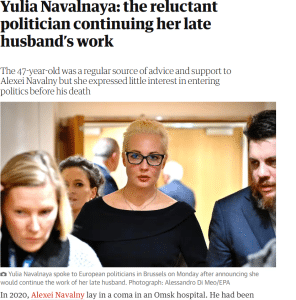 Η χήρα του Αλεξέι Ναβάλνι, η οποία κατηγόρησε ευθέως τον Πούτιν για τον θάνατο του συζύγου της λέγοντας ότι ο ηγέτης της ρωσικής αντιπολίτευσης δηλητηριάστηκε με τον νευροπαραλυτικό παράγοντα Novichok, κρατούσε πάντα χαμηλούς τόνους επιμένοντας ότι ο κύριος ρόλος της ήταν αυτός της συζύγου και της μητέρας και όχι ως πολιτικός.