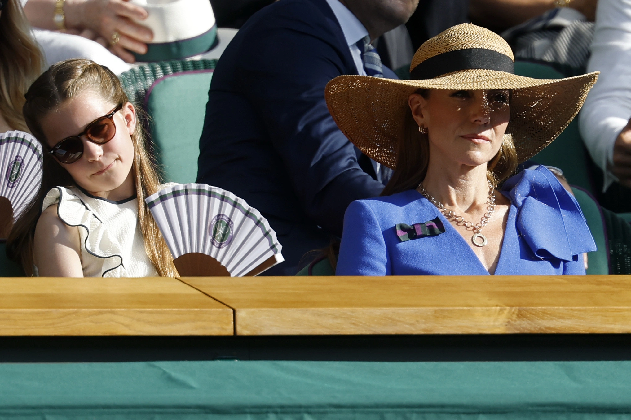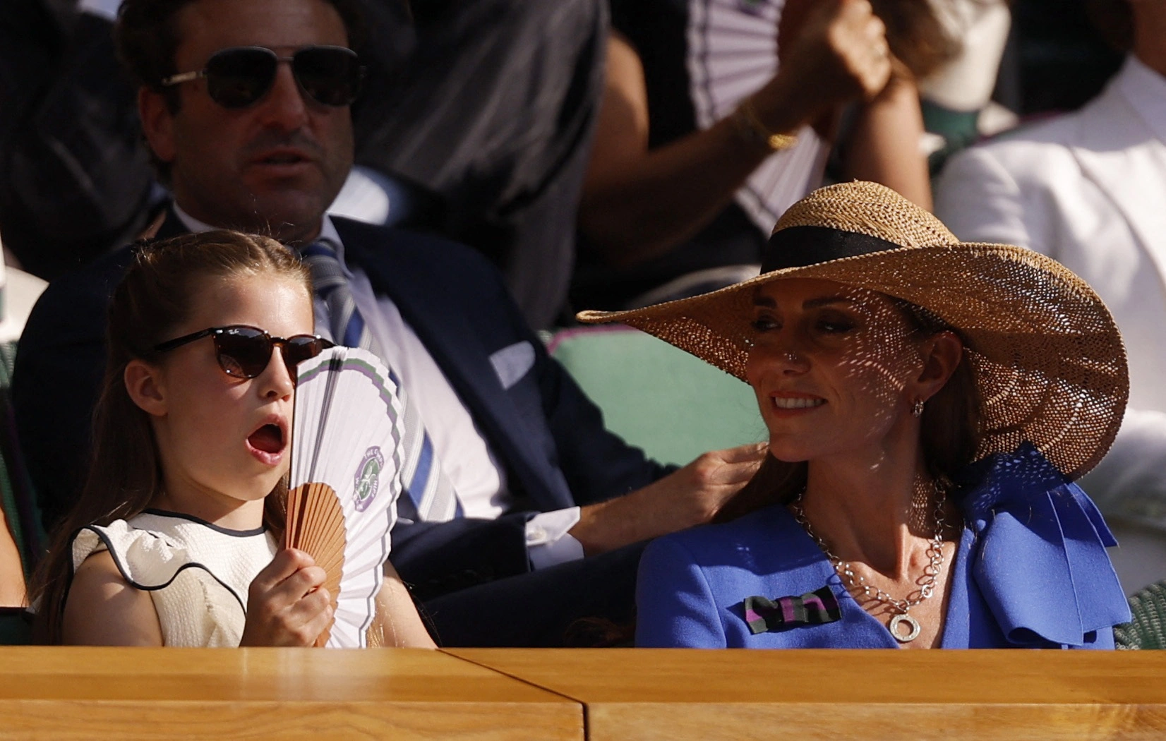 Η Κέιτ Μίντλετον εμφανίστηκε κομψή στον τελικό του Wimbledon με το χαρακτηριστικό «φιόγκο του Wimbledon», σύμβολο της ιδιότητάς της ως βασιλικής προστάτιδας. Συνόδευσε το look της με καφέ γόβες, ψάθινο καπέλο, λευκό τσαντάκι, μενταγιόν και γυαλιά ηλίου. Μαζί με τη Σάρλοτ κάθισαν δίπλα-δίπλα, μιλούσαν και χρησιμοποιούσαν βεντάλιες.