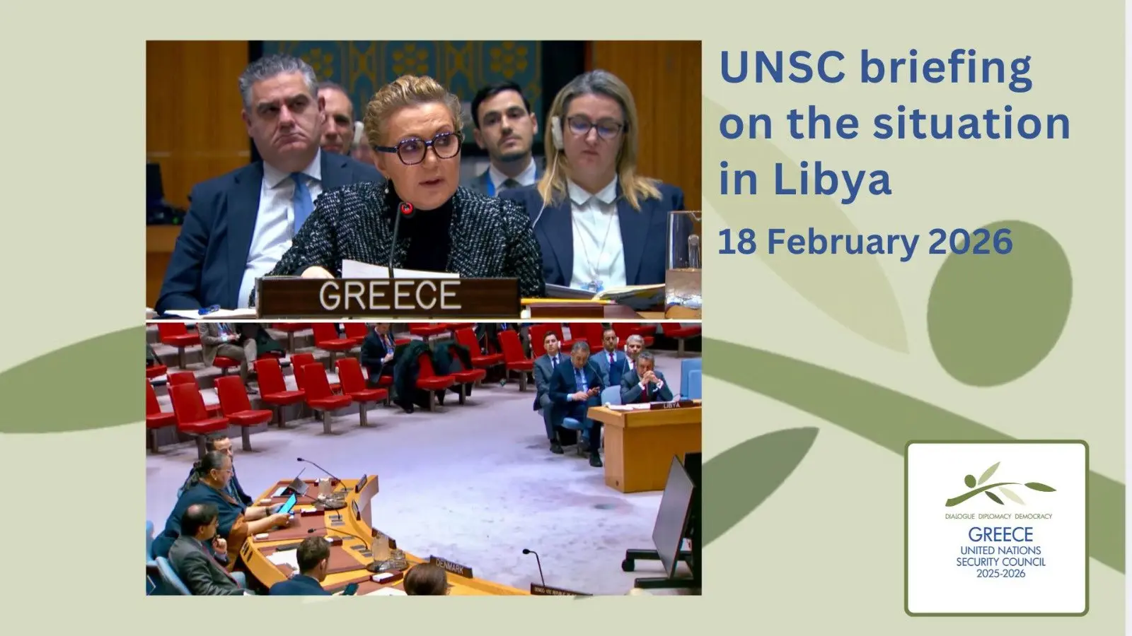 Η Μόνιμη Αντιπρόσωπος της Ελλάδας, πρέσβυς Αγ. Μπαλτά στην τοποθέτηση της εξέφρασε πλήρη στήριξη προς την Ειδική Αντιπρόσωπο του Γενικού Γραμματέα στη Λιβύη, Χ. Τέτε καθώς και στον πολιτικό οδικό χάρτη της Αποστολής του ΟΗΕ στη χώρα, ο οποίος απαιτεί τη δέσμευση όλων των σχετικών λιβυκών, περιφερειακών και διεθνών εμπλεκόμενων μερών.