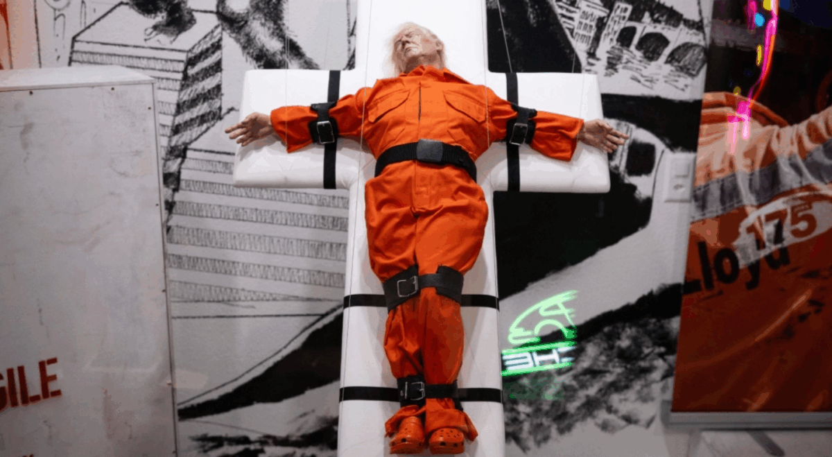 Ένα εντυπωσιακά ρεαλιστικό και προκλητικό γλυπτό του Βρετανού καλλιτέχνη Μέισον Στορμ εκτίθεται στη Βασιλεία της Ελβετίας, απεικονίζοντας τον Ντόναλντ Τραμπ «σταυρωμένο» σε ένα φορείο που θυμίζει κρεβάτι εκτέλεσης. Το έργο από ρητίνη, με τίτλο «Άγιος ή Αμαρτωλός», παρουσιάζει τον πρώην Αμερικανό πρόεδρο με πορτοκαλί φόρμα κρατουμένου, κλειστά μάτια και δεμένο σώμα σε σταυροειδή στάση.