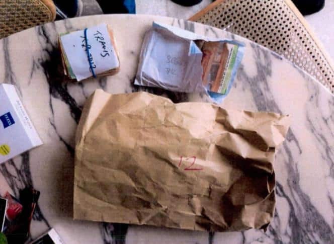 Το ρεπορτάζ του ιστότοπου Sudinfo επικαλείται την αναφορά των αστυνομικών που έψαξαν το σπίτι του γιου της ευρωβουλευτή στις 19 Ιουλίου. Σύμφωνα με αυτή, βρέθηκαν δεσμίδες στην τραπεζαρία, σε μεγάλους καφέ φακέλους και επάνω είχαν αριθμούς με μαρκαδόρο, ενώ άλλες εντοπίστηκαν ακόμη και στο μπαλκόνι του σπιτιού που γειτνιάζει με αυτό της Μαρί Αρένα.