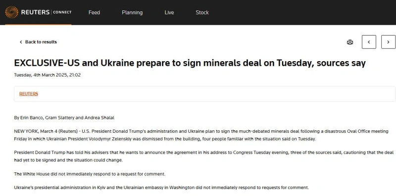 Τέλος, δήλωσε επίσης ότι η Ουκρανία είναι έτοιμη να υπογράψει τη συμφωνία για ορυκτά και ασφάλεια οποτεδήποτε και με οποιαδήποτε μορφή, χαρακτηρίζοντάς την «βήμα προς μεγαλύτερη ασφάλεια και εγγυήσεις».