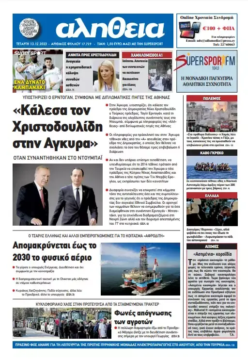 Το δημοσίευμα της εφημερίδας «Αλήθεια» επικαλείται διπλωματικές πηγές της Αθήνας και περιγράφει πως ο Νίκος Χριστοδουλίδης συνάντησε τον Τούρκο πρόεδρο, Ρετζέπ Ταγίπ Ερντογάν, στο περιθώριο της διεθνούς διάσκεψης για την κλιματική αλλαγή στο Ντουμπάι.