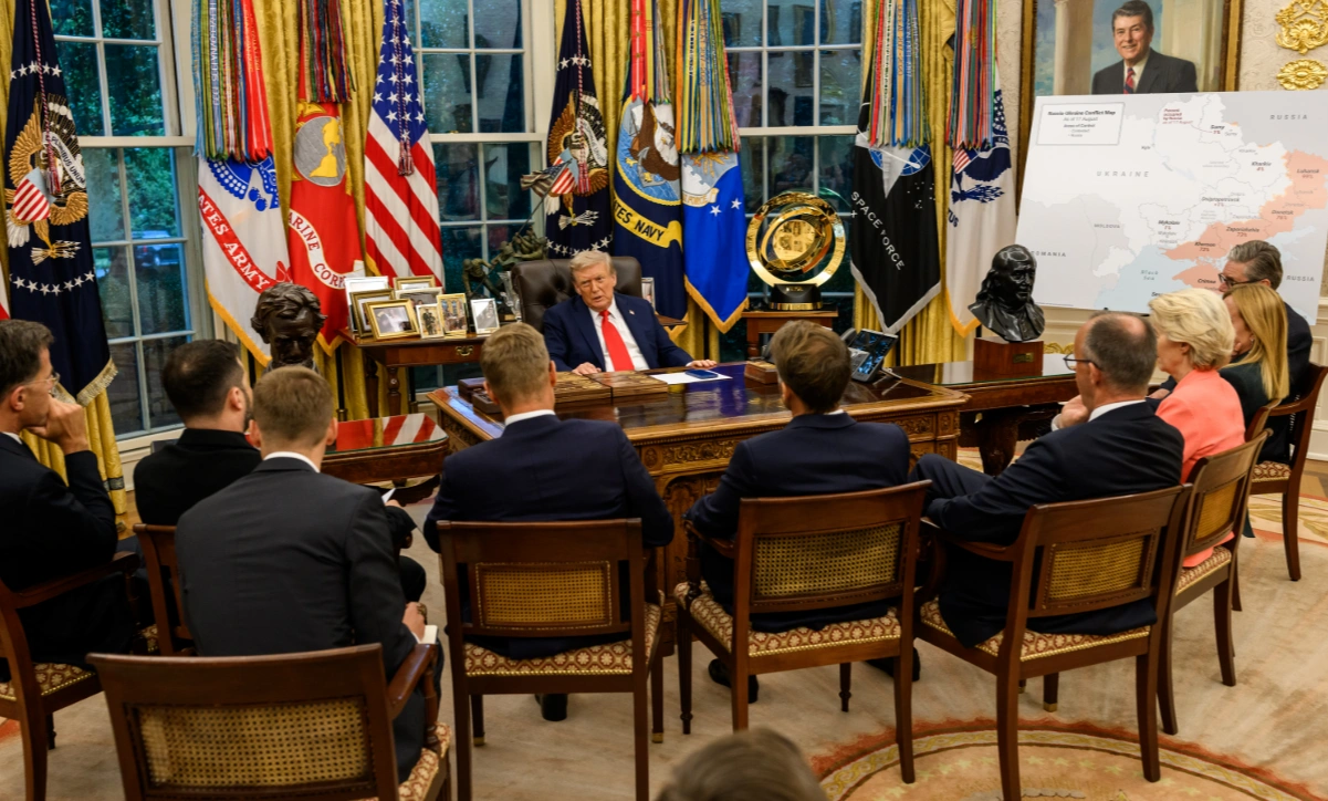 Εντύπωση προκάλεσαν οι φωτογραφίες που κυκλοφόρησαν το πρωί της Δευτέρας από τη σύσκεψη στον Λευκό Οίκο. Ο Ντόναλντ Τραμπ διακρίνεται καθισμένος στο γραφείο του, με τους υπόλοιπους ηγέτες παραταγμένους απέναντί του. Η σύνθεση της εικόνας δεν άργησε να σχολιαστεί στα μέσα κοινωνικής δικτύωσης, με πολλούς να τη χαρακτηρίζουν ως «σκηνή τάξης», παρομοιάζοντας τον Τραμπ με δάσκαλο και τους Ευρωπαίους με… μαθητές του.