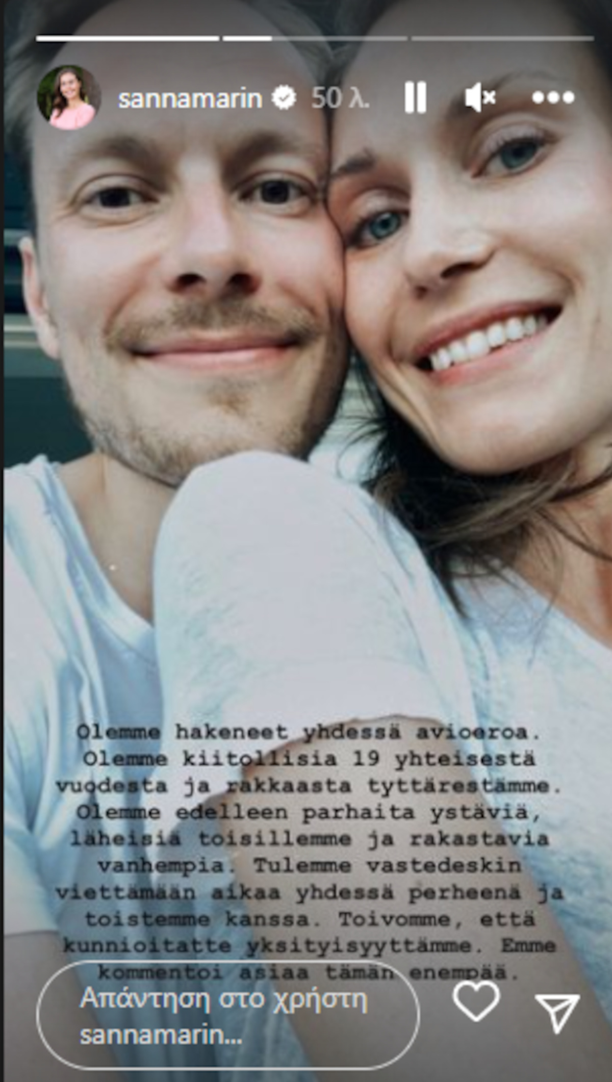 «Υποβάλαμε από κοινού αίτηση διαζυγίου. Είμαστε ευγνώμονες για τα 19 χρόνια μαζί και για την αγαπημένη μας κόρη», έγραψε η Σάνα Μαρίν στο Instagram.