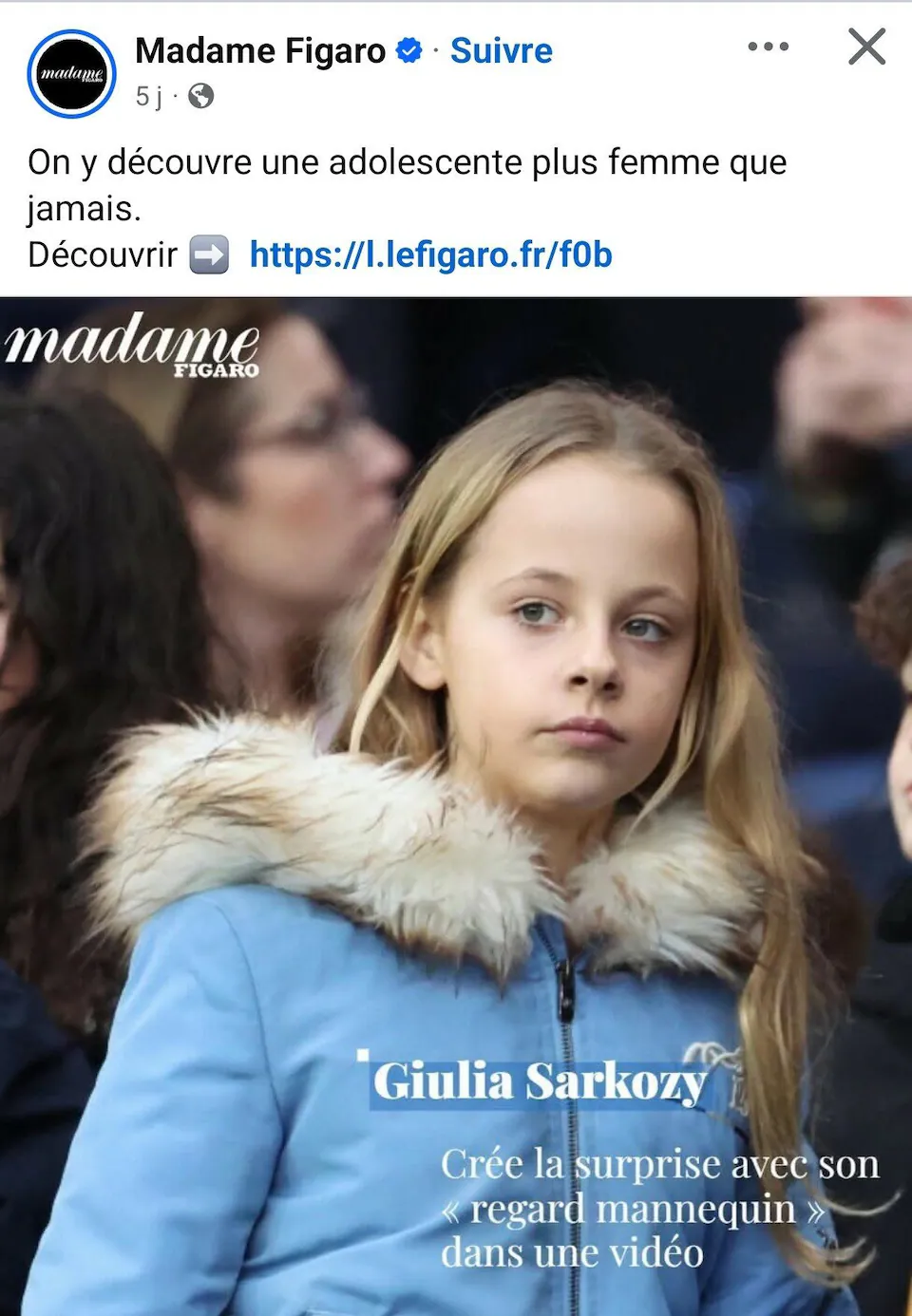 Με αφορμή τα βίντεο που αναρτά η 13χρονη Τζούλια Σαρκοζί στο TikTok, δημοφιλές γαλλικό περιοδικό έγραψε για την κόρη του πρώην προέδρου της Γαλλίας: «Ανακαλύψαμε μια έφηβη που είναι πιο γυναίκα από ποτέ». Η παρατήρηση του περιοδικού απέσπασε κυρίως αρνητικά σχόλια, καθώς πρόκειται για ένα 13χρονο παιδί, το όνομα του οποίου χρησιμοποιείται απροστάτευτα, σε μια συζήτηση περί γυναικείας ομορφιάς.
