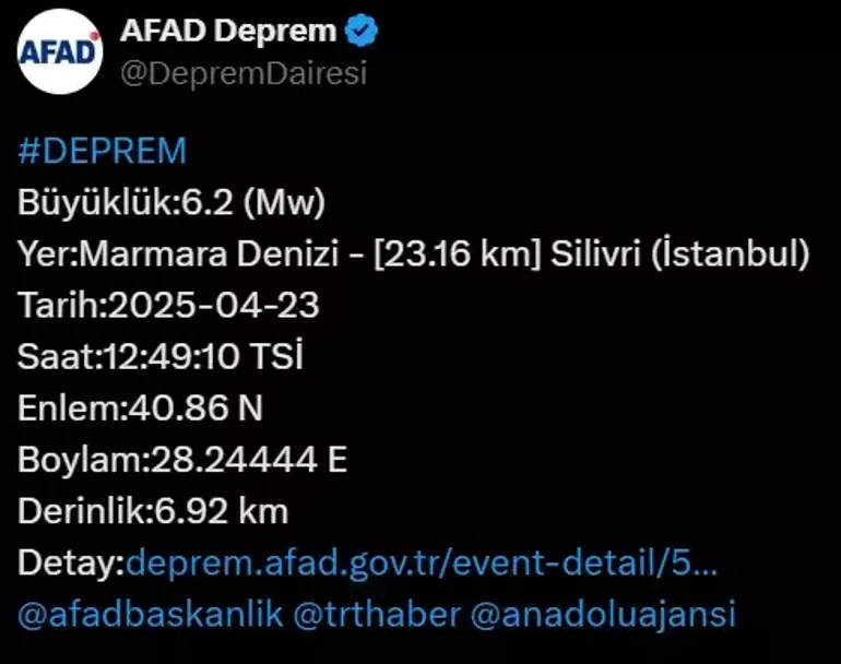 Felt in several cities around the Marmara Sea.#Ultimahora #Earthquake #Sismo #Terremoto #Temblor #Deprem pic.twitter.com/FWE4Sw8UqR— LW World News (@LoveWorld_Peopl) April 23, 2025