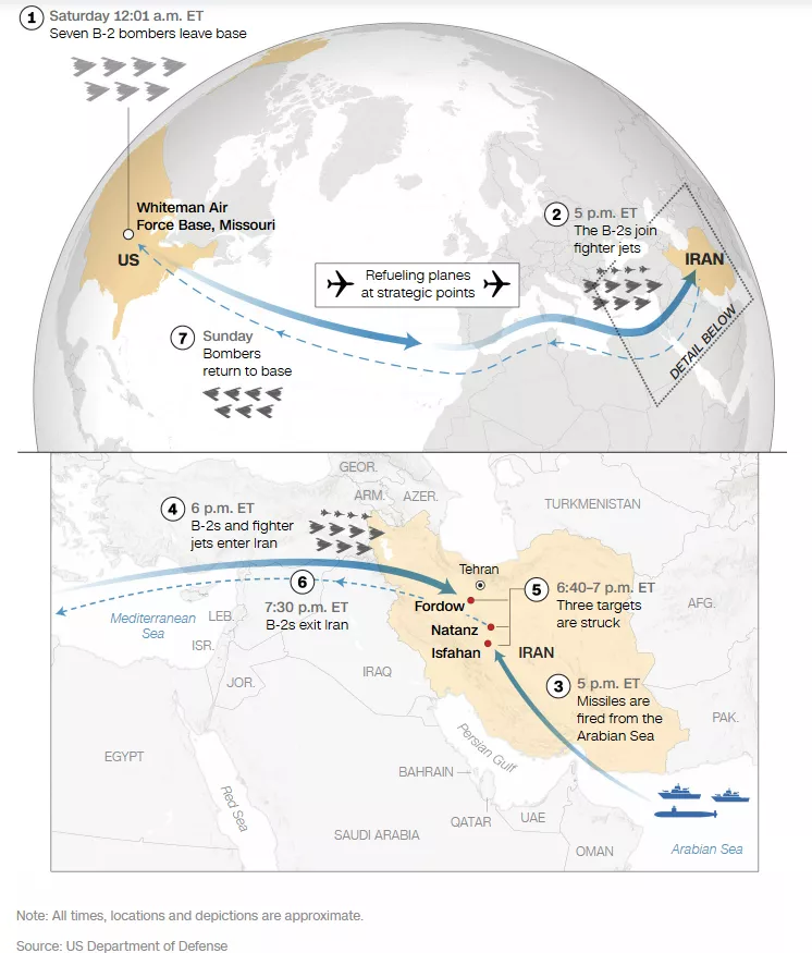 Σάββατο 17:00 Eastern Time (Κυριακή μεσάνυχτα ώρα Ελλάδας) τα βομβαρδιστικά B-2 συνοδεύουν πλέον μαχητικά αεροσκάφη, ενώ πύραυλοι εκτοξεύονται από αμερικανικά σκάφη στην Αραβική Θάλασσα στους πυρηνικούς σταθμούς Φορντό, Νατάνζ και Ισφαχάν για την προστασία των αεροσκαφών.
